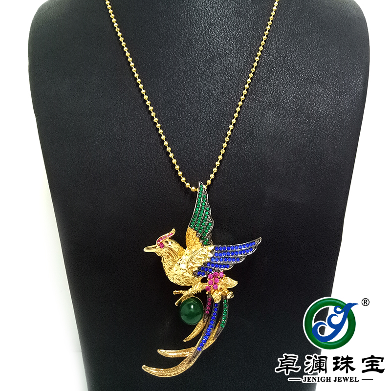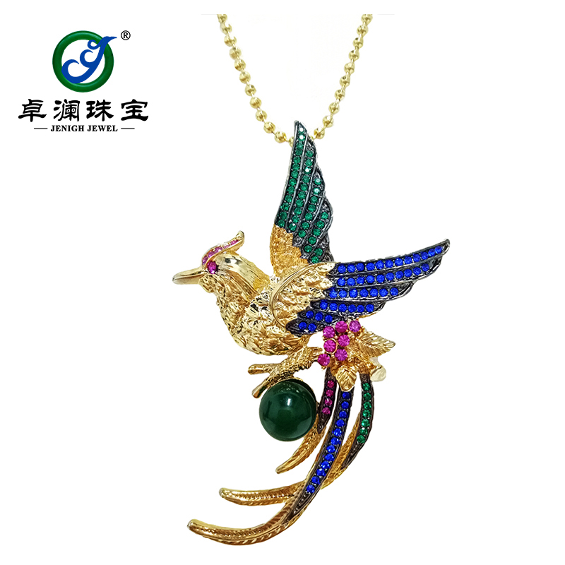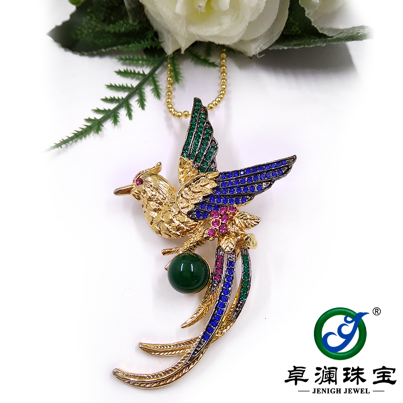 商品品牌:卓澜珠宝-【凤来仪】 商品特色:原创手工系列 用途功能:胸针、吊坠两用款 商品材质:天然绿玉髓、微镶工艺 商品形状: 珠形 商品质量:21.82g
