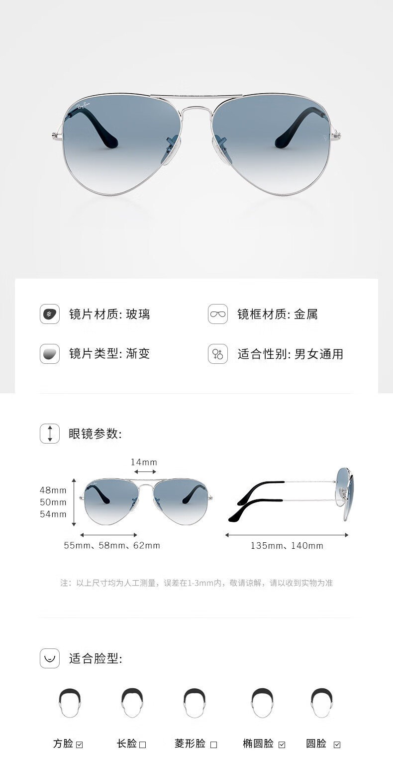 • 眼镜品牌: 雷朋(Ray.Ban) • 眼镜型号:0RB3025 • 眼镜毛重:100.00g • 镜片材质:其它 • 眼镜类型:彩膜太阳镜 • 镜架材质:合金 • 上市时间:往季 • 适用性别:通用 • 眼镜配件类型:镜布,镜盒,说明书 • 眼镜风格:中性风 • 镜框形状:异形 • 眼镜功能:防UVA,防UVB