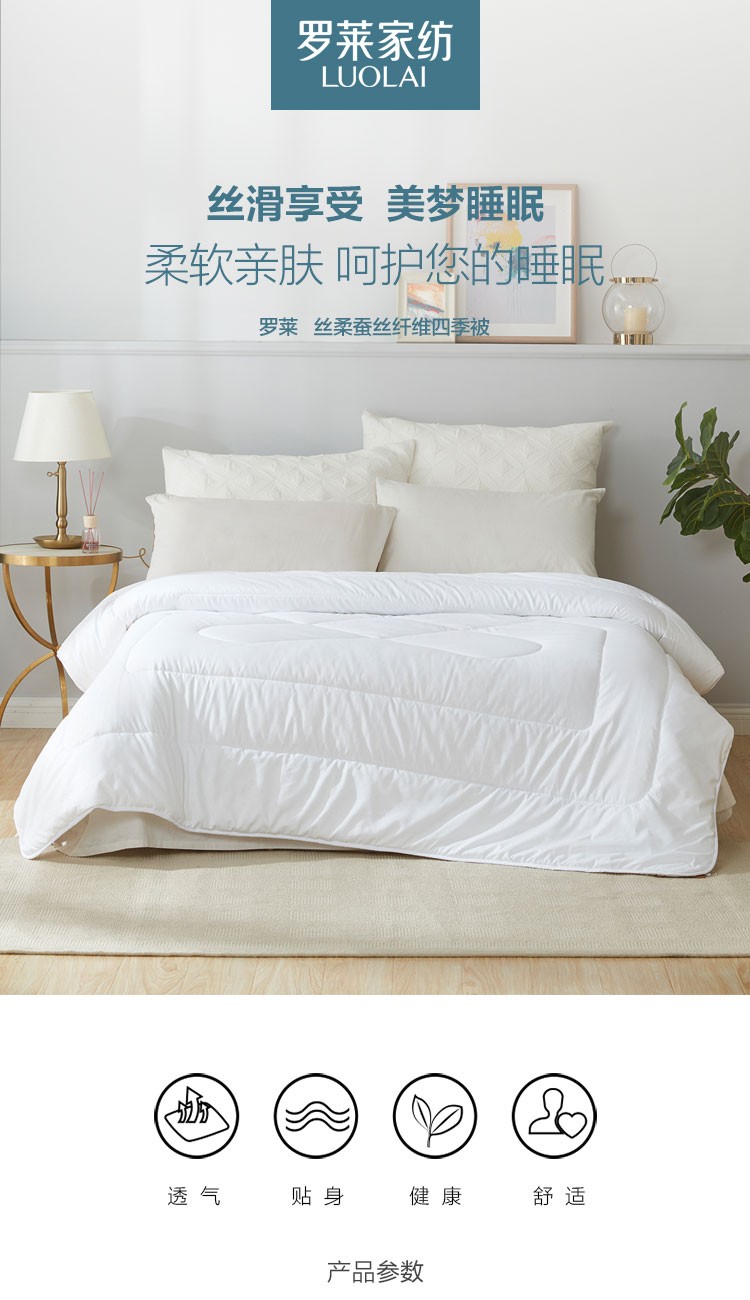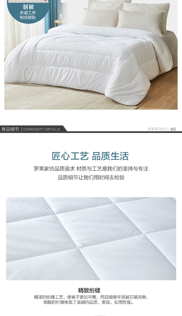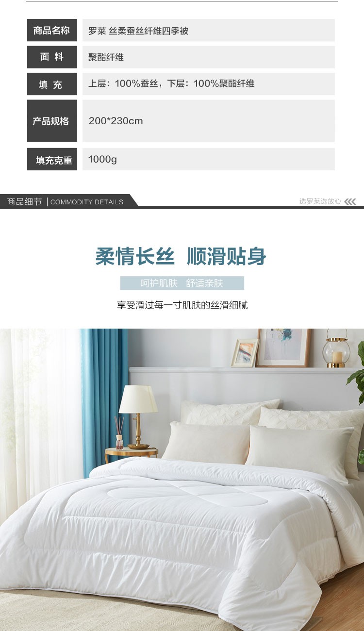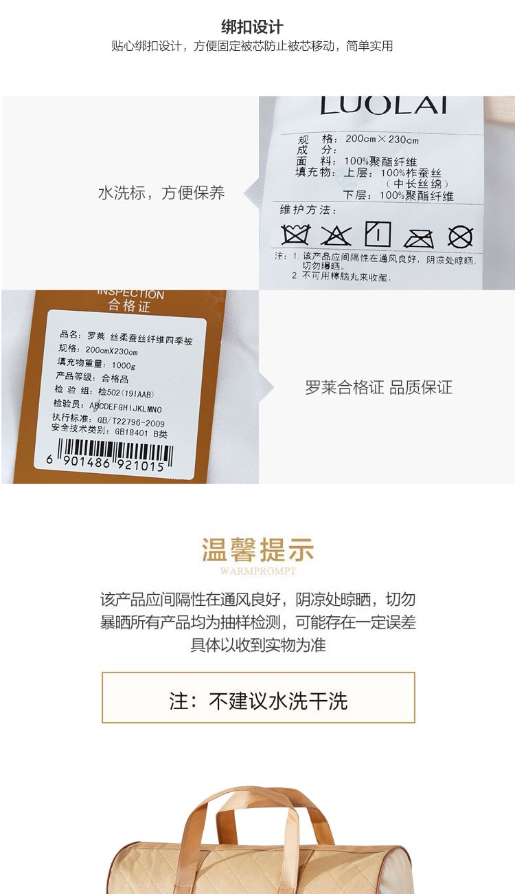 • 商品品牌:罗莱家纺LUOLAI • 商品毛重:1.0kg • 商品产地:中国大陆 • 适用人数:双人 • 商品尺寸:200*230cm • 适用季节:四季 • 填充物净重:1.0(含)-1.5(不含)kg • 丝含量:50%(含)-60%(不含) • 商品面料:聚酯 • 纤维重量:1.1-2斤蚕丝 • 商品种类:柞蚕丝 • 制作工艺:绗缝 • 适用人群:成人 • 蚕丝长度:长丝绵 • 商品规格:单被