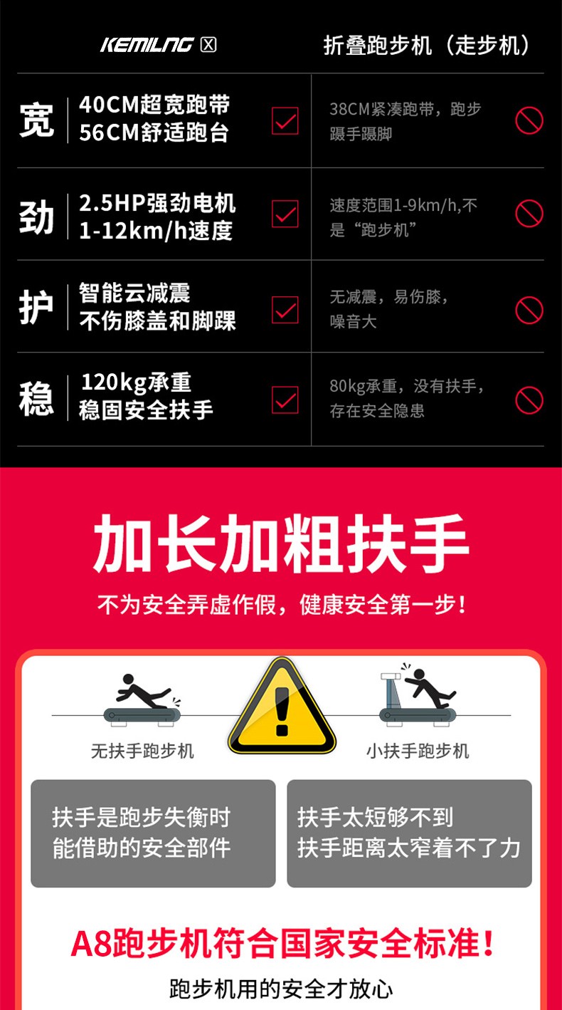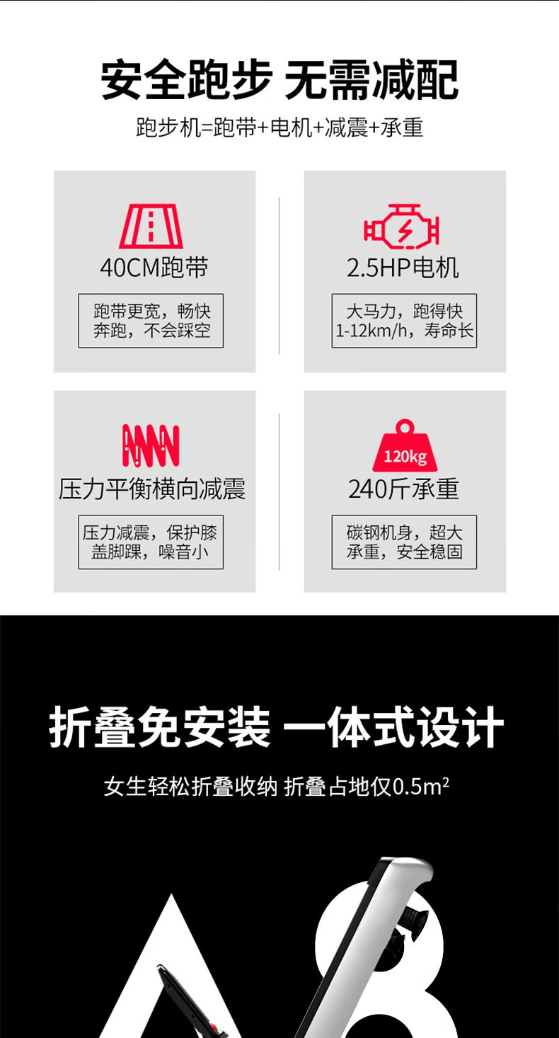 • 商品毛重:37.0kg • 货号:A8 • 屏幕尺寸:7吋及以下 • 驱动方式:电动 • 屏幕种类:电子屏 • 上市时间:2020年春季 • 心率测试:无类别:单功能最大速度:6km/h(不含)-12km/h(含) • 是否可折叠:可折叠 • 跑带宽度:42cm以下(不含) • 坡度调节:其它