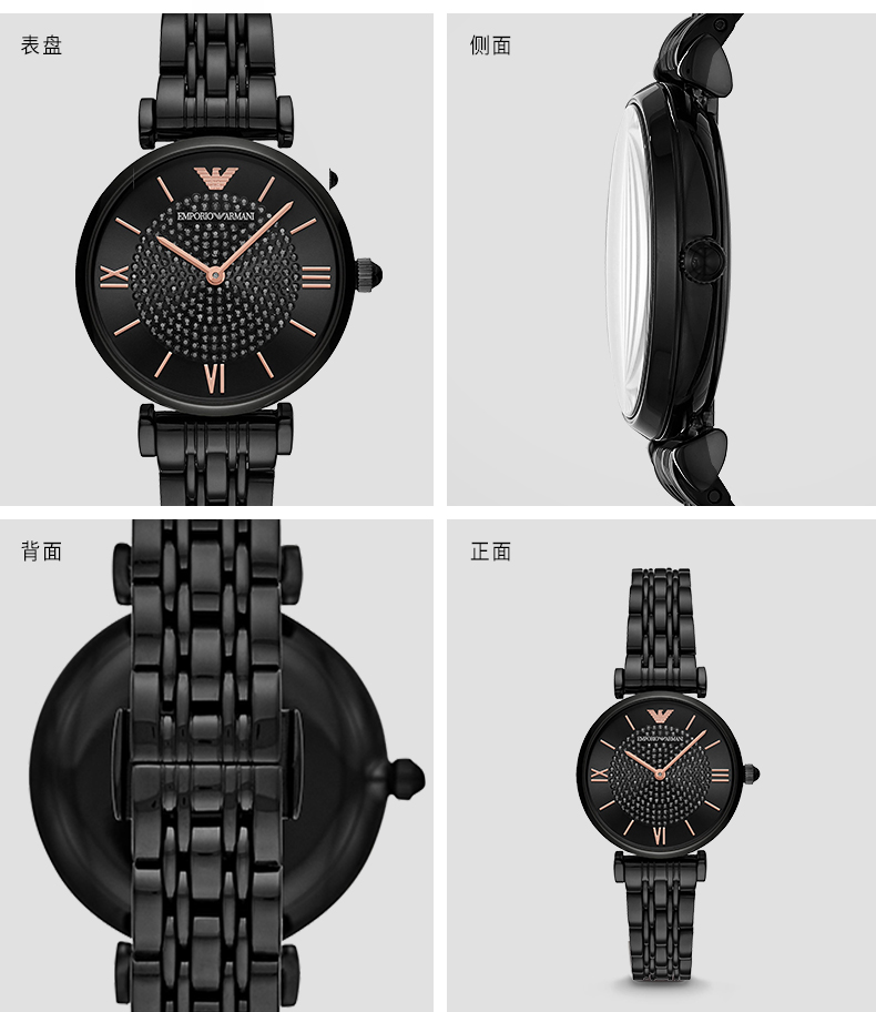 • 手表品牌: EMPORIO ARMANI阿玛尼 • 手表风格: 时尚 • 手表形状: 圆形 • 手表类型: 石英机芯 • 表带材质: 不锈钢表盘 • 手表厚度: 8mm • 表盘直径: 32mm • 表壳材质: 不锈钢 • 手表种类: 女表扣 • 手表款式: 蝴蝶双按扣 • 防水深度: 30米生活防水 • 手表镜面材质: 矿物强化玻璃镜面
