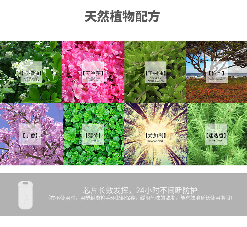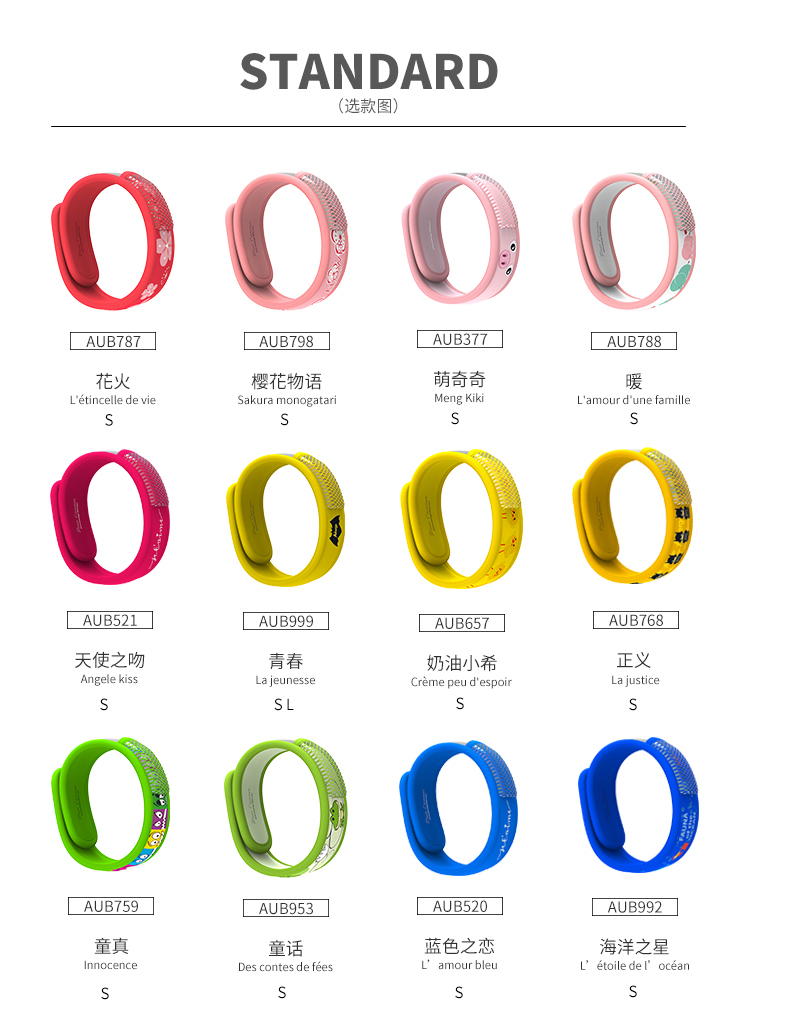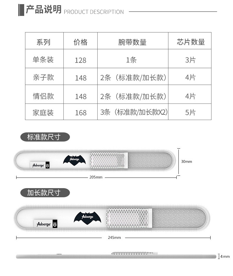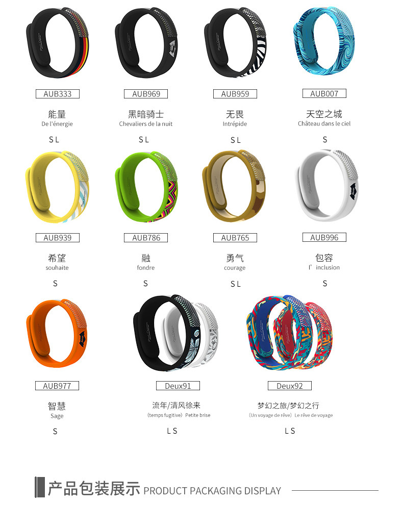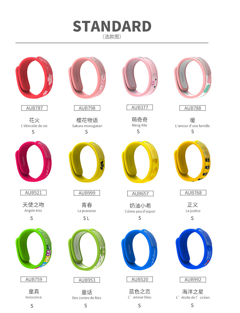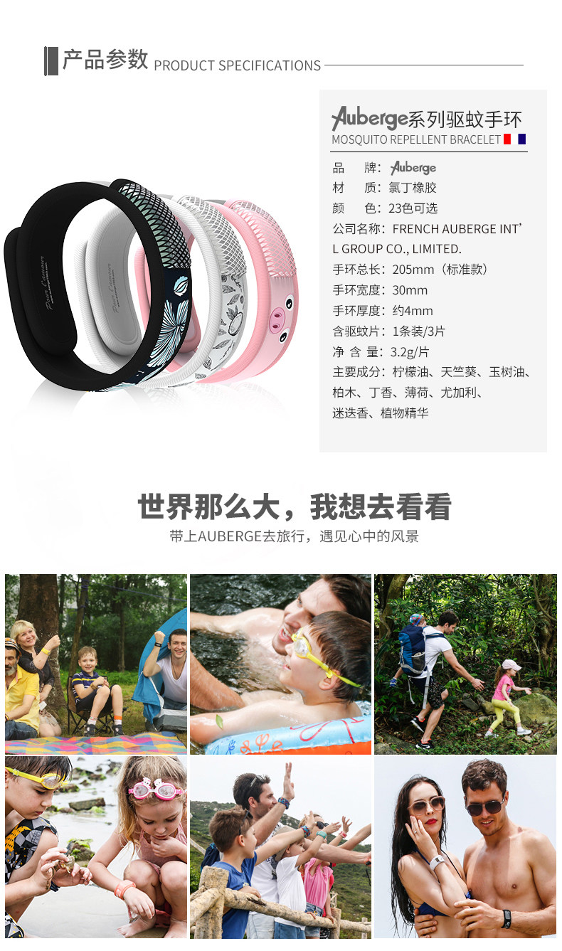 · 商品品牌:AUBERGE法国艾比 · 适用年龄: 新生 · 颜色分类: 家庭款、 亲子款、儿童组合、情侣款 · 具体规格: 系列 2片(含)-5片(含) · 腕带材质:潜水布 · 驱蚊片材质:氯丁橡胶 · 净含量:3.2g/片 · 使用人群:成人、儿童均使用 · 主要成分:玉树油、柠檬油、薄荷、尤加利、柏木、迷迭香、丁香、天竺葵织物精华