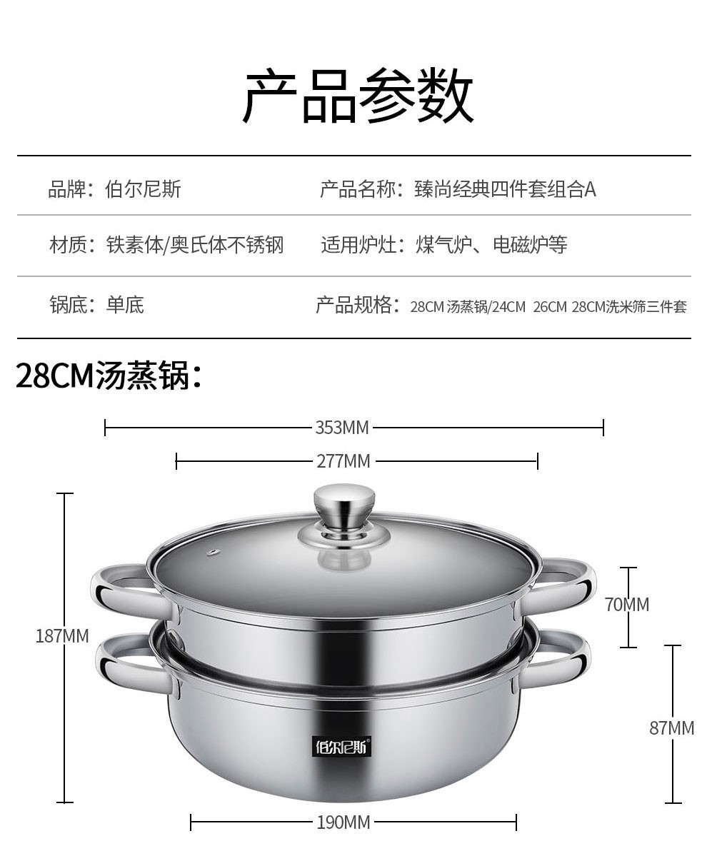 • 商品品牌:伯尔尼斯(BERNESE) • 商品型号:BENS-233 • 商品毛重:1.8kg • 组合规格:四件套 • 商品材质:不锈钢