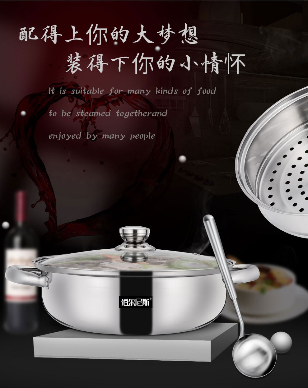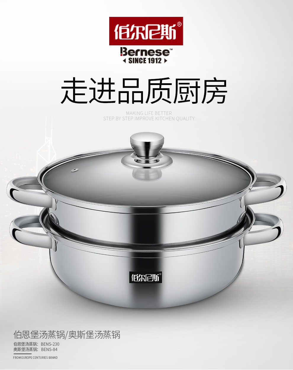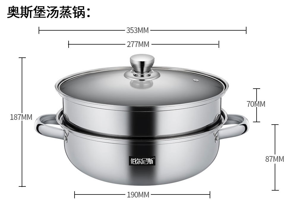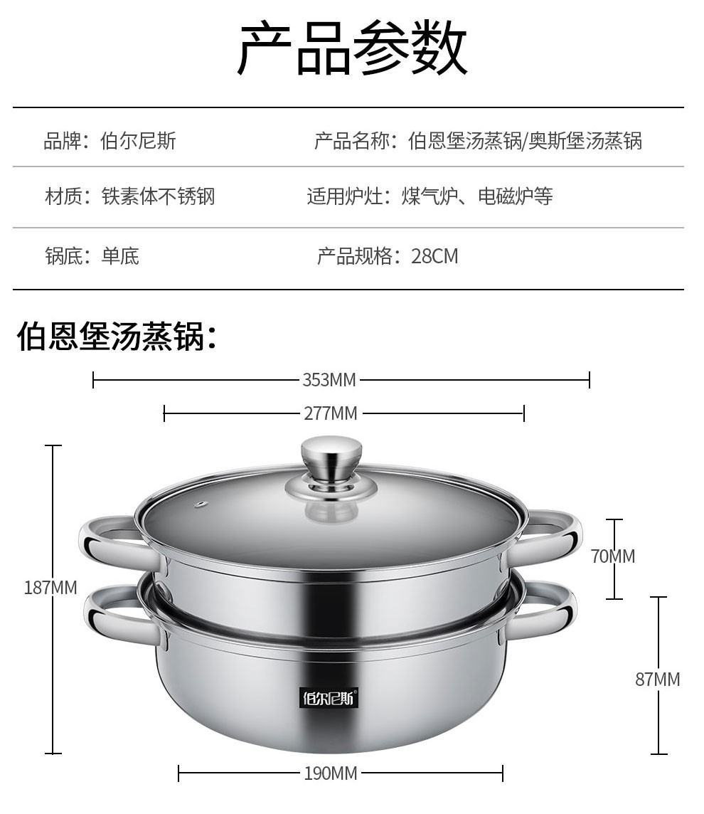 • 商品品牌: 伯尔尼斯(BERNESE) • 商品型号:BENS-230 • 商品毛重:2.0kg • 商品产地:中国大陆 • 商品直径:28cm • 商品材质:不锈钢 • 锅底类型:单底 • 适用炉灶:通用 • 商品层数:2层