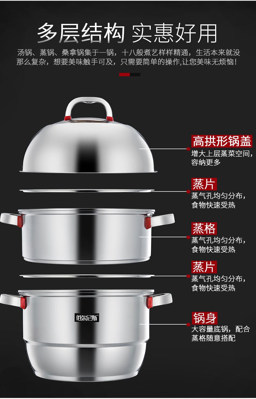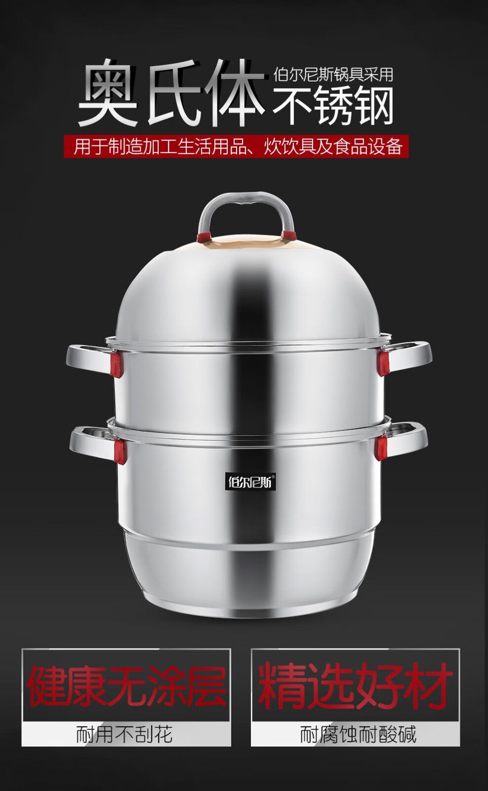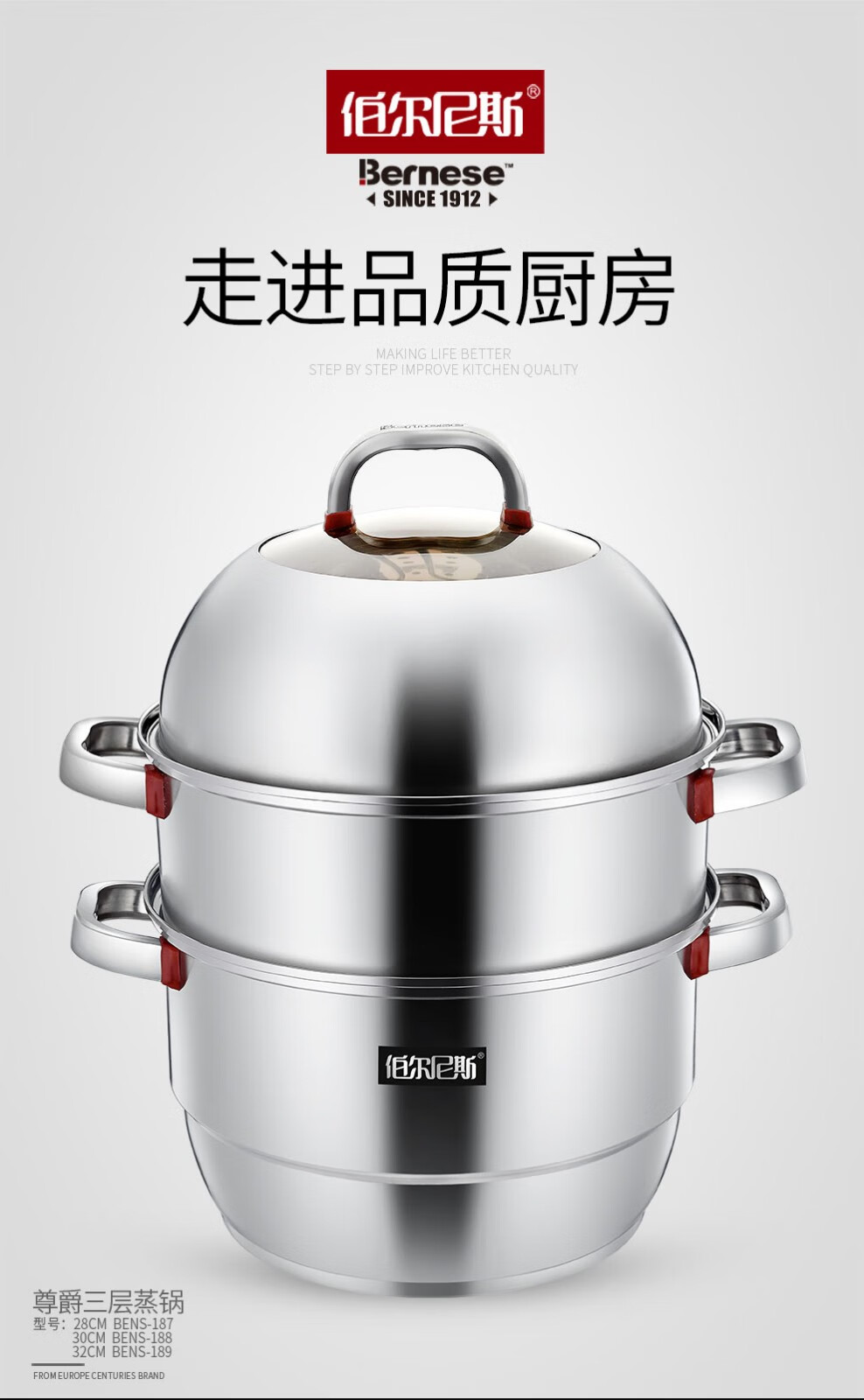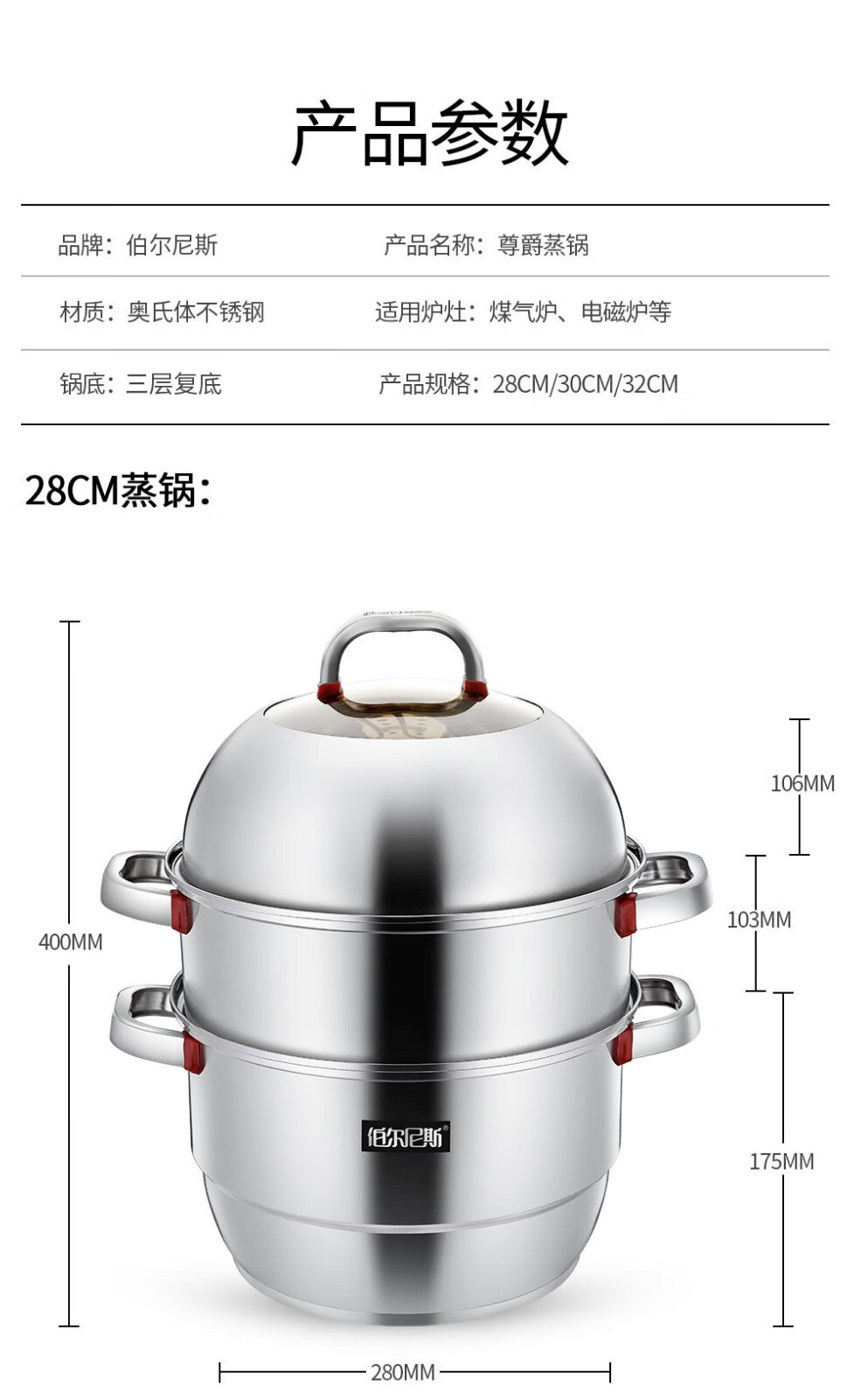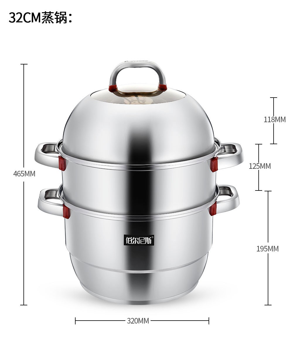 • 商品品牌:伯尔尼斯(BERNESE) • 商品型号:BENS-187 • 商品毛重:4.0kg • 商品直径:28cm • 商品材质:不锈钢 • 锅底类型:多层底 • 商品层数:3层