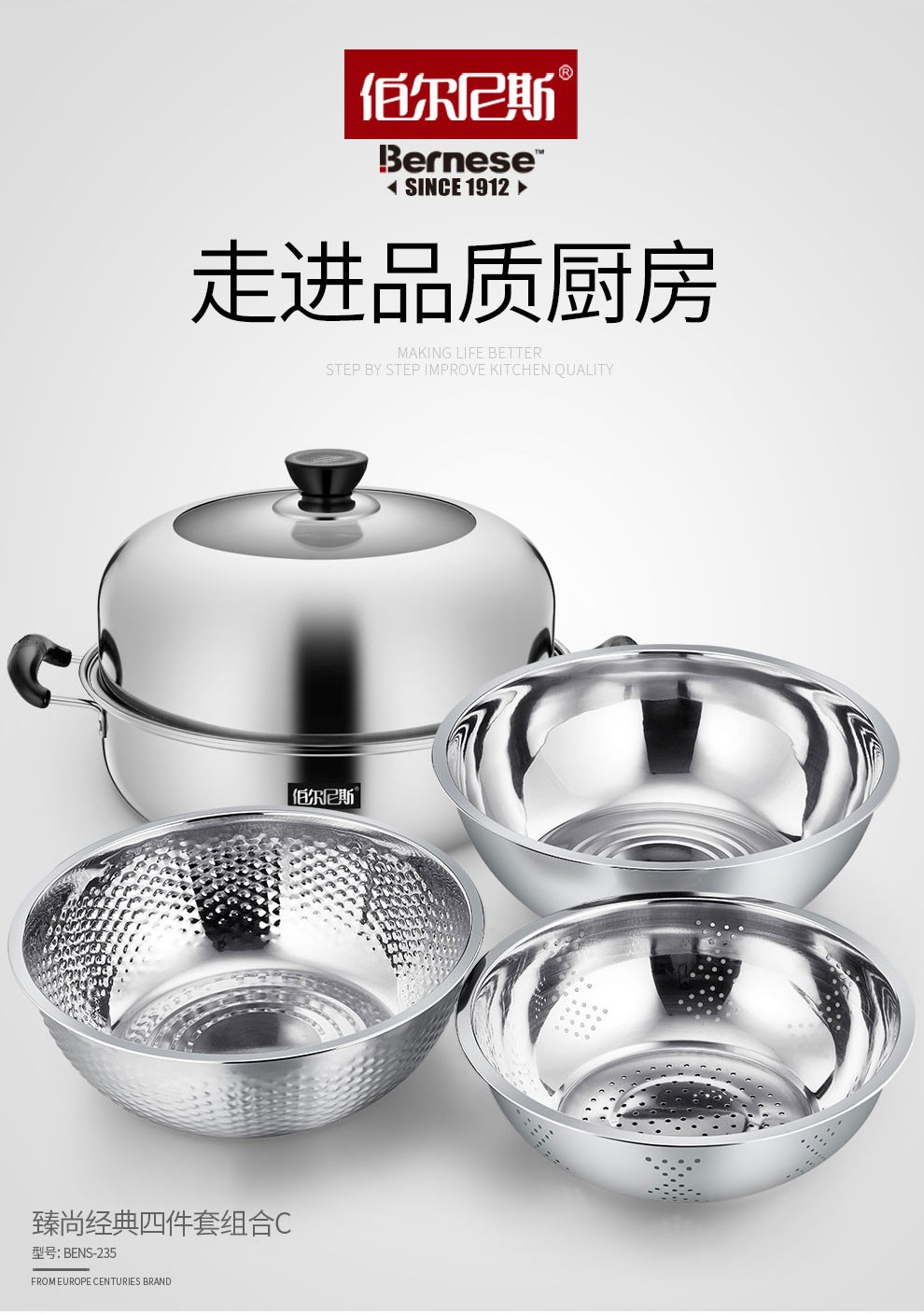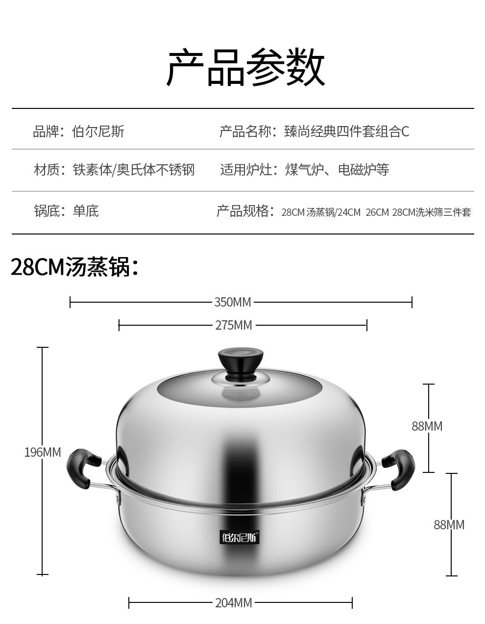 • 商品品牌:伯尔尼斯(BERNESE) • 商品型号:BENS-235 • 商品毛重:1.8kg • 适用炉灶:通用 • 商品材质:不锈钢 • 组合规格:四件套 • 组合类型:锅具组合