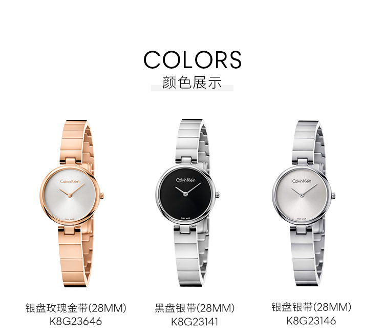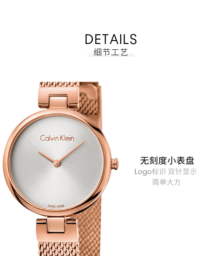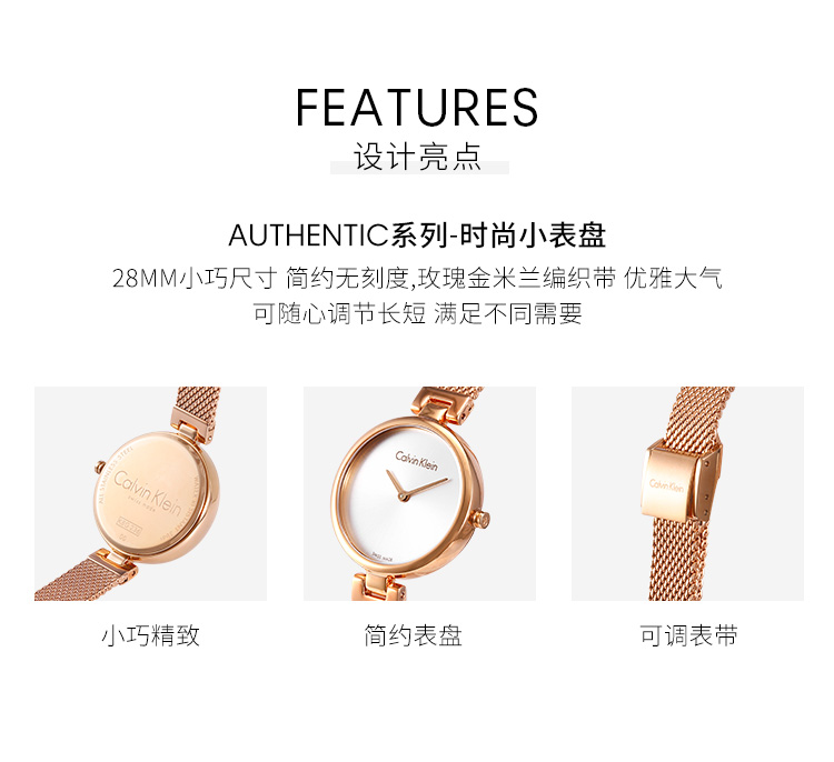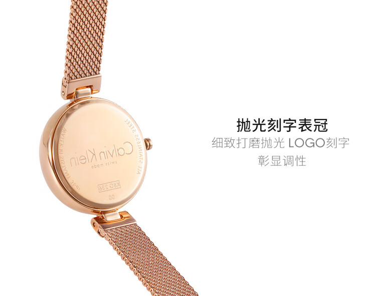 · 手表品牌:卡文克莱CALVIN KLEIN (CK) · 手表系列:AUTHENTIC纯正系列 · 手表型号:K8G23121 · 手表毛重:340.00g · 手表机芯:石英 · 适用人群:女士 · 手表风格:休闲风,时尚,极简 · 防水等级:生活防水 · 手表表带:不锈钢