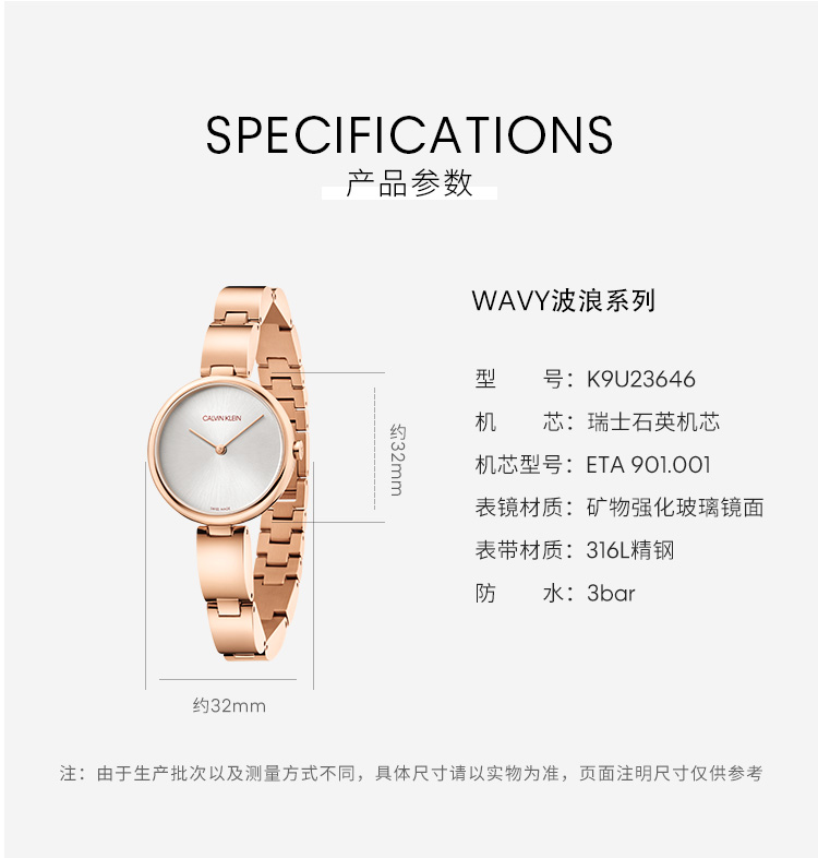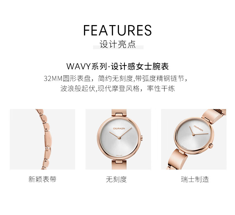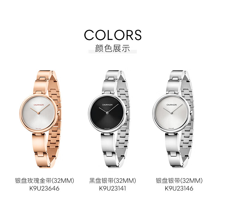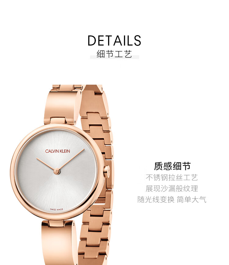 · 手表品牌:卡文克莱CALVIN KLEIN (CK) · 手表系列:AUTHENTIC纯正系列 · 手表型号:K8G23646 · 手表毛重:400.00g · 手表机芯:石英 · 适用人群:女士 · 防水等级:生活防水 · 手表表带:不锈钢