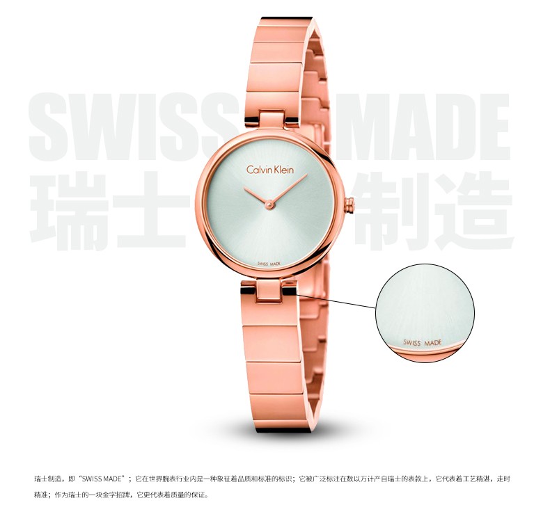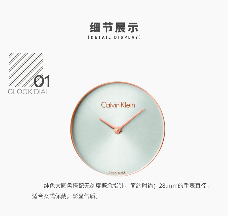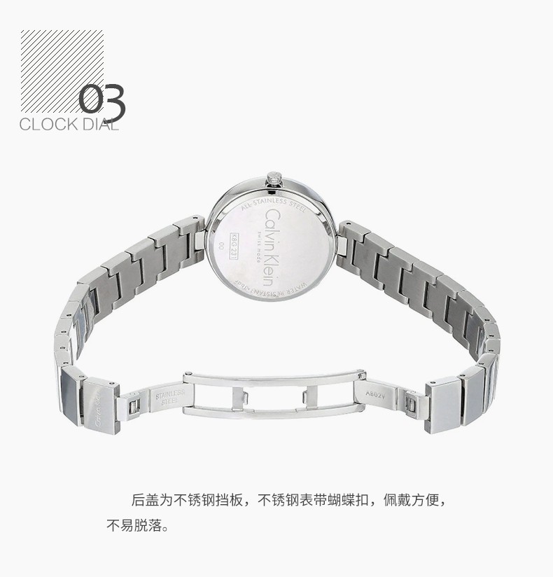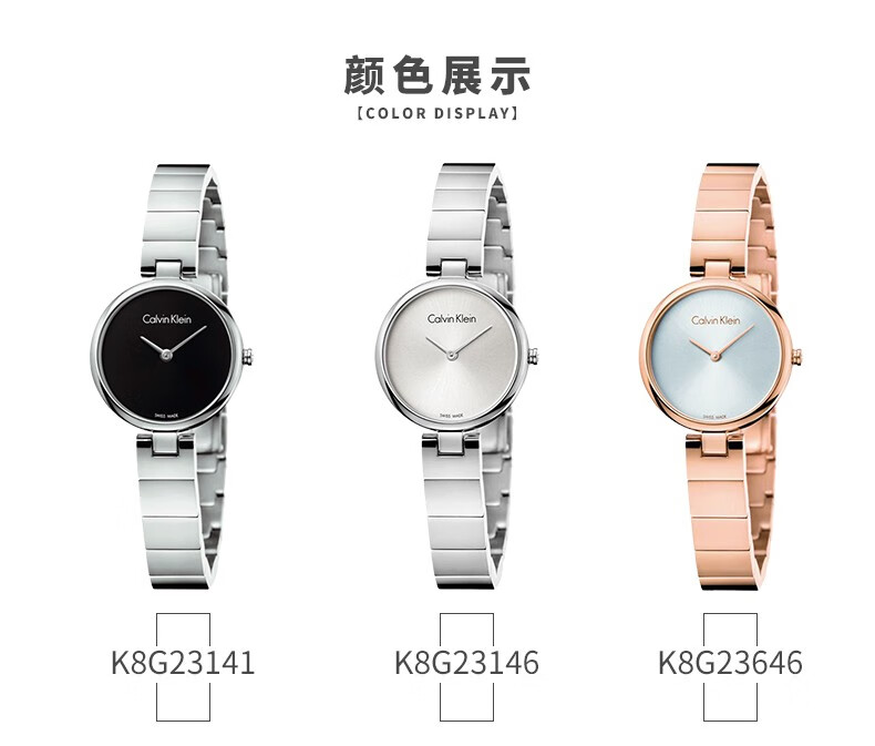 · 手表品牌:卡文克莱CALVIN KLEIN (CK) · 手表系列:AUTHENTIC纯正系列 · 手表型号:K8G23141 · 手表毛重:400.00g · 手表机芯:石英 · 适用人群:女士 · 手表风格:休闲风,时尚,极简 · 防水等级:30米 · 手表表带:不锈钢