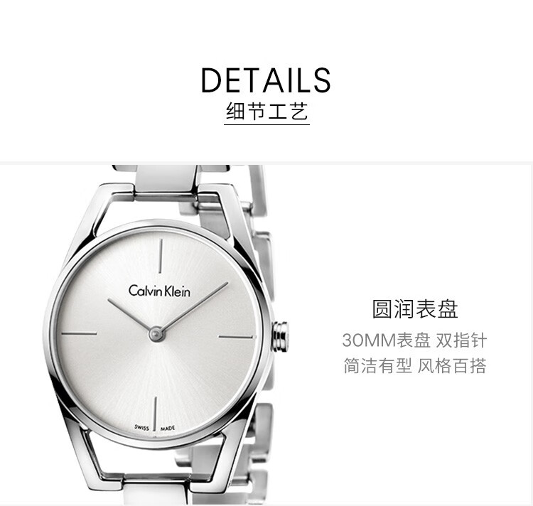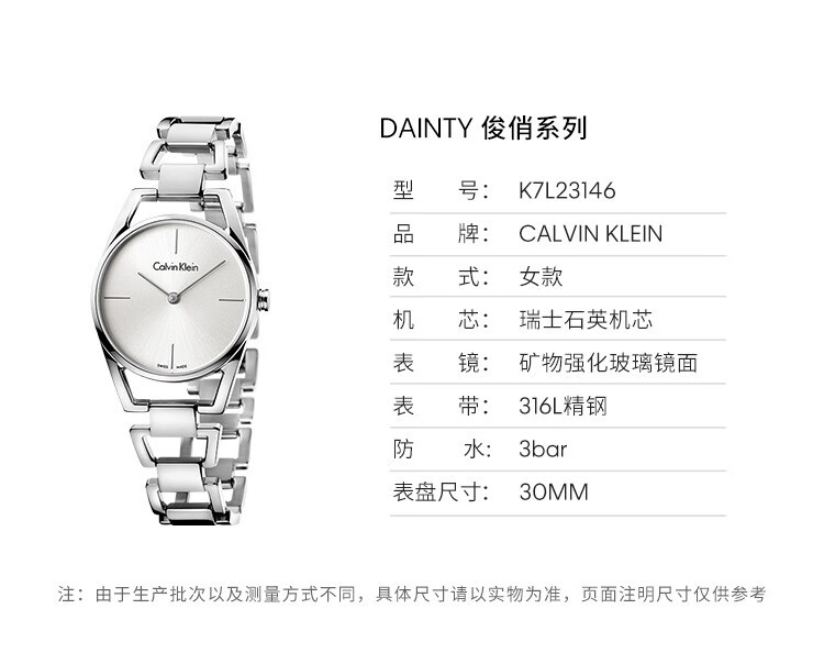 · 手表品牌:卡文克莱CALVIN KLEIN (CK) · 手表系列:DAINTY俊俏系列 · 手表型号:K7L23141 · 手表毛重:410.00g · 手表表扣:其它 · 手表表带:其它· 手表表盘:圆形 · 手表功能:其它 · 手表机芯:石英 · 适用人群:中性 · 手表表径:29-35mm · 手表风格:商务,时尚 · 防水等级:生活防水 · 手表表底:不透底 · 手表表壳:其它