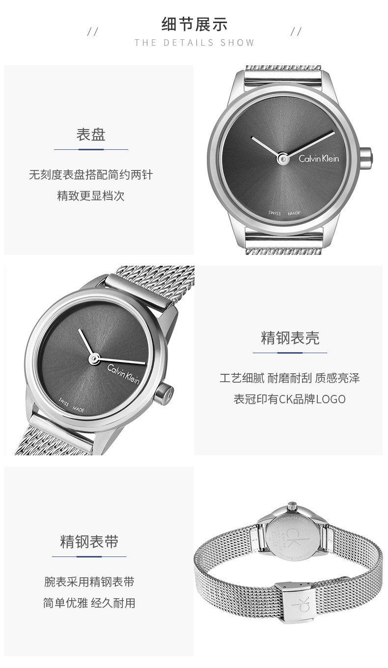 卡文克莱CALVIN KLEIN MINIMAL简约系列石英女表K3M231Y3-灰盘米兰表带