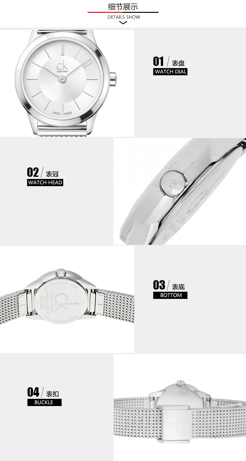· 手表品牌:卡文克莱CALVIN KLEIN (CK) · 手表系列:MINIMAL简约系列 · 手表型号:K3M23126 · 手表毛重:310.00g · 手表表扣:折叠扣 · 手表表带:金属 · 手表表盘:圆形 · 手表功能:其它 · 手表机芯:石英 · 适用人群:女士 · 手表表径:28mm及以下 · 手表风格:时尚 · 防水等级:生活防水 · 手表表底:不透底 · 手表表壳:其它