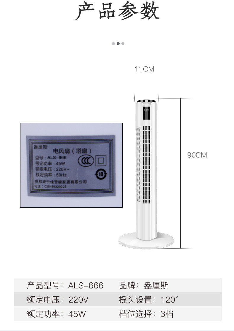 • 电扇型号: ASL-666 • 电扇类别: 塔扇 • 电源方式: 交流电 • 颜色分类: 陶瓷白 • 最大定时范围: 无定时 • 是否含遥控: 无 • 能效等级: 无 • 控制方式: 机械式 • 智能类型: 不支持智能 • 最大噪音: 无 • 电扇尺寸: 90cm