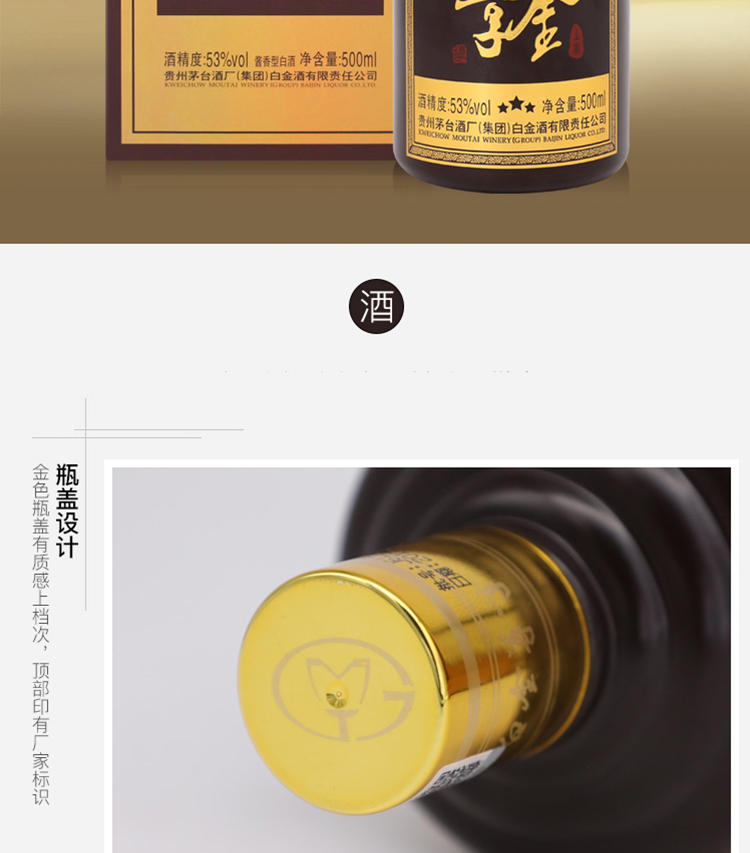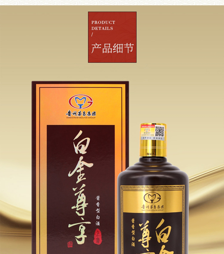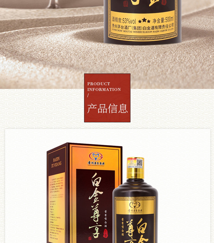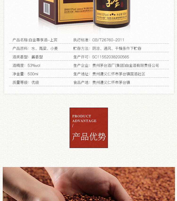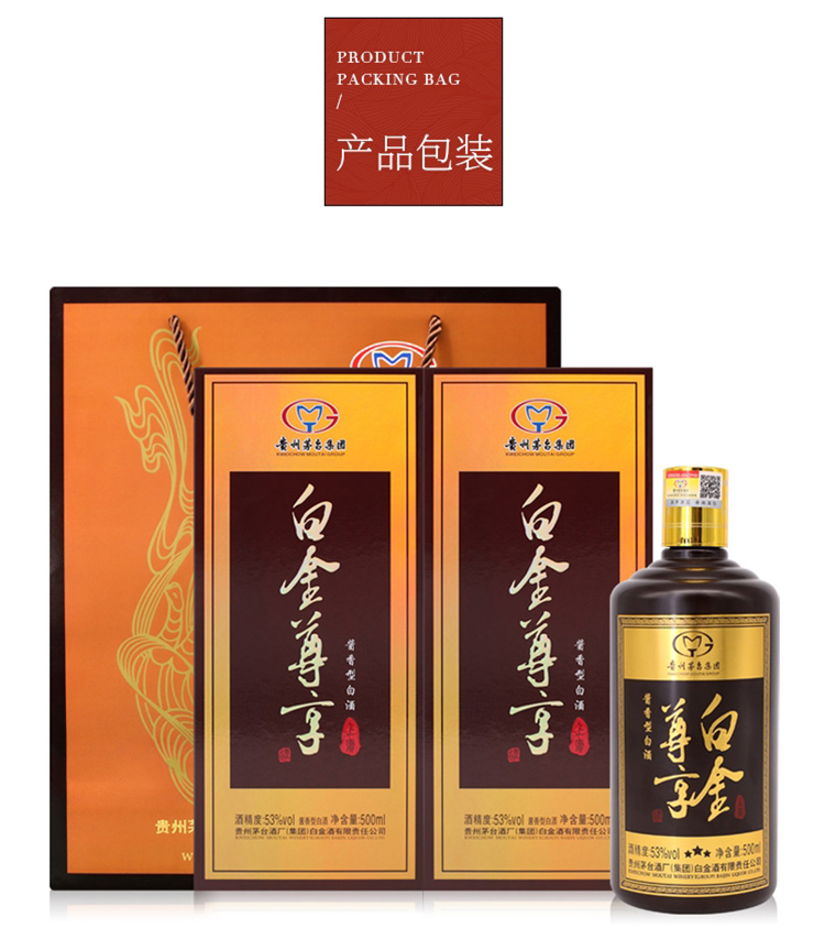 • 白酒香型:酱香型 • 酒精度:53度 • 单支容量:500 • 白酒产地:中国贵州遵义市