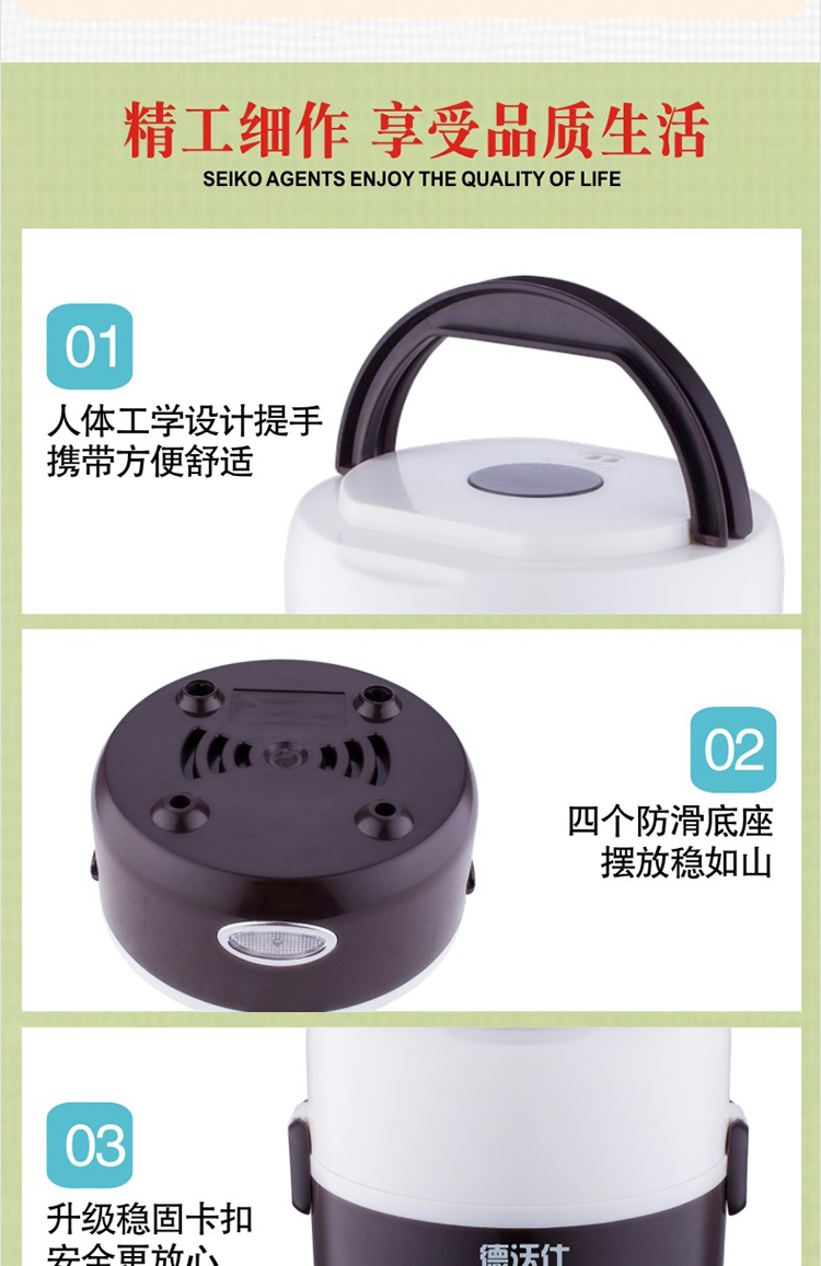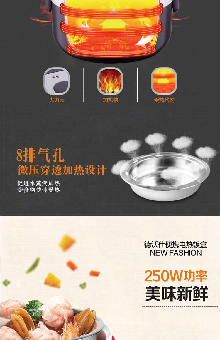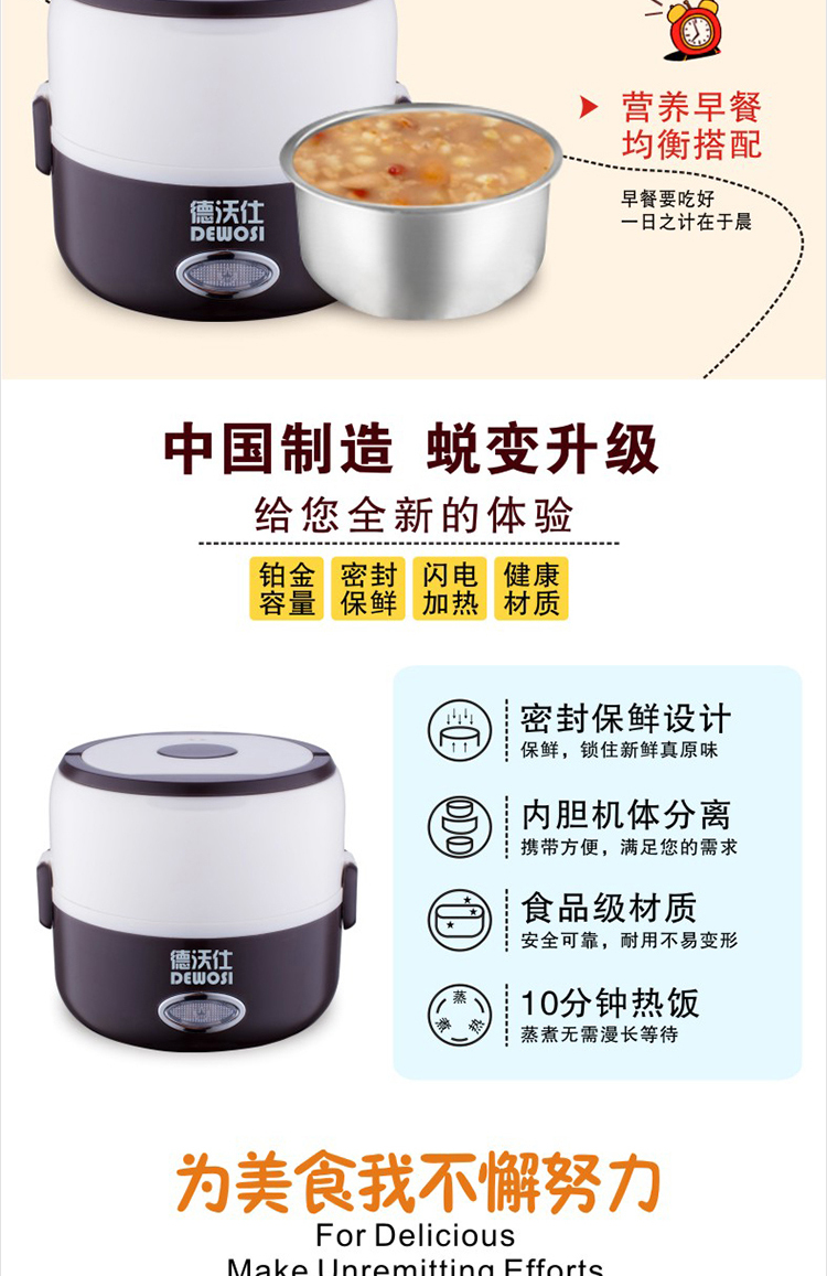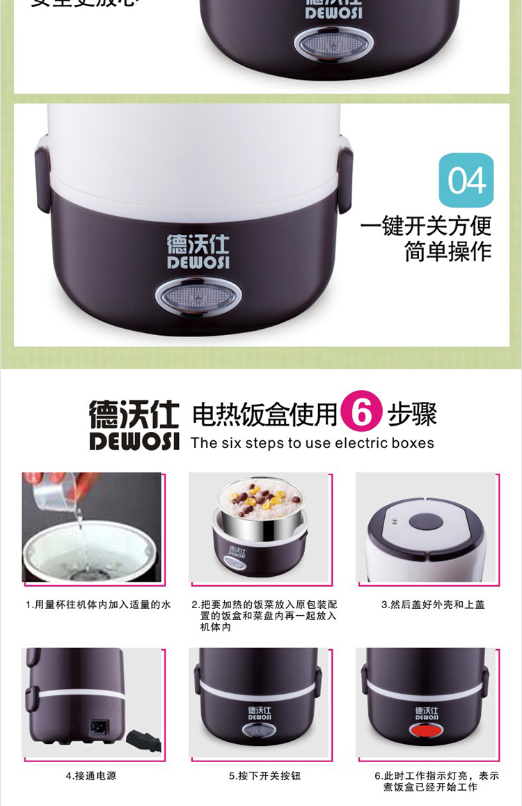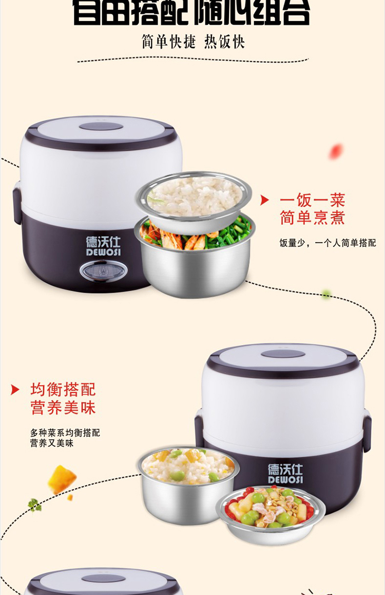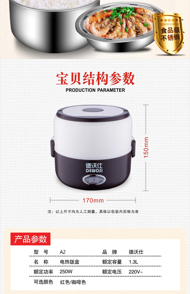 • Brand: DEWOSI • Model: A2 1.3L • Inner bile: stainless steel inner bile • Exterior material: stainless steel • Featured features: Timing function • Electric lunch box function: heating • Control: Microcomputer-style • Number of layers: 2 • Capacity: 1.2-1.5L ***Remarks: Not Shipped Individual Item to XingJiang ***