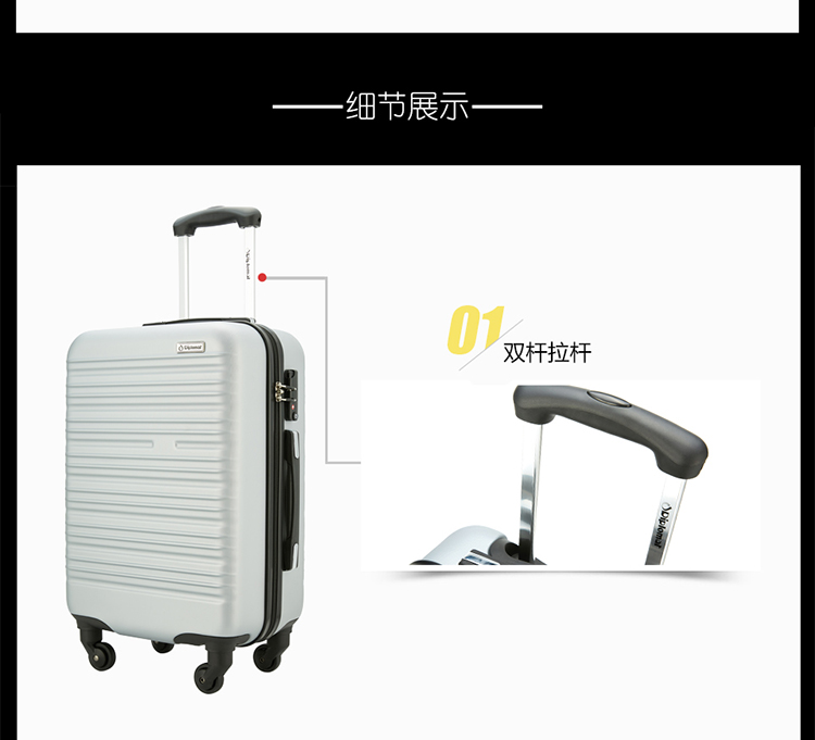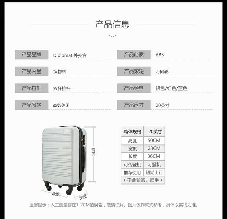 • Brand: DIPLOMAT • Gross weight: 4.2kg • Origin: Chinese mainland • Type of lever: double bar • Wheel type: universal wheel • Lock Type: TSA Customs Lock • Size: 20 inches • Category: Deng Chassis • Locked: Yes • Suitable for: Middle-aged • Closed mode: zipper • Material: ABS • Scenario: Travel • Gender: Universal • Bag hardness: hard case
