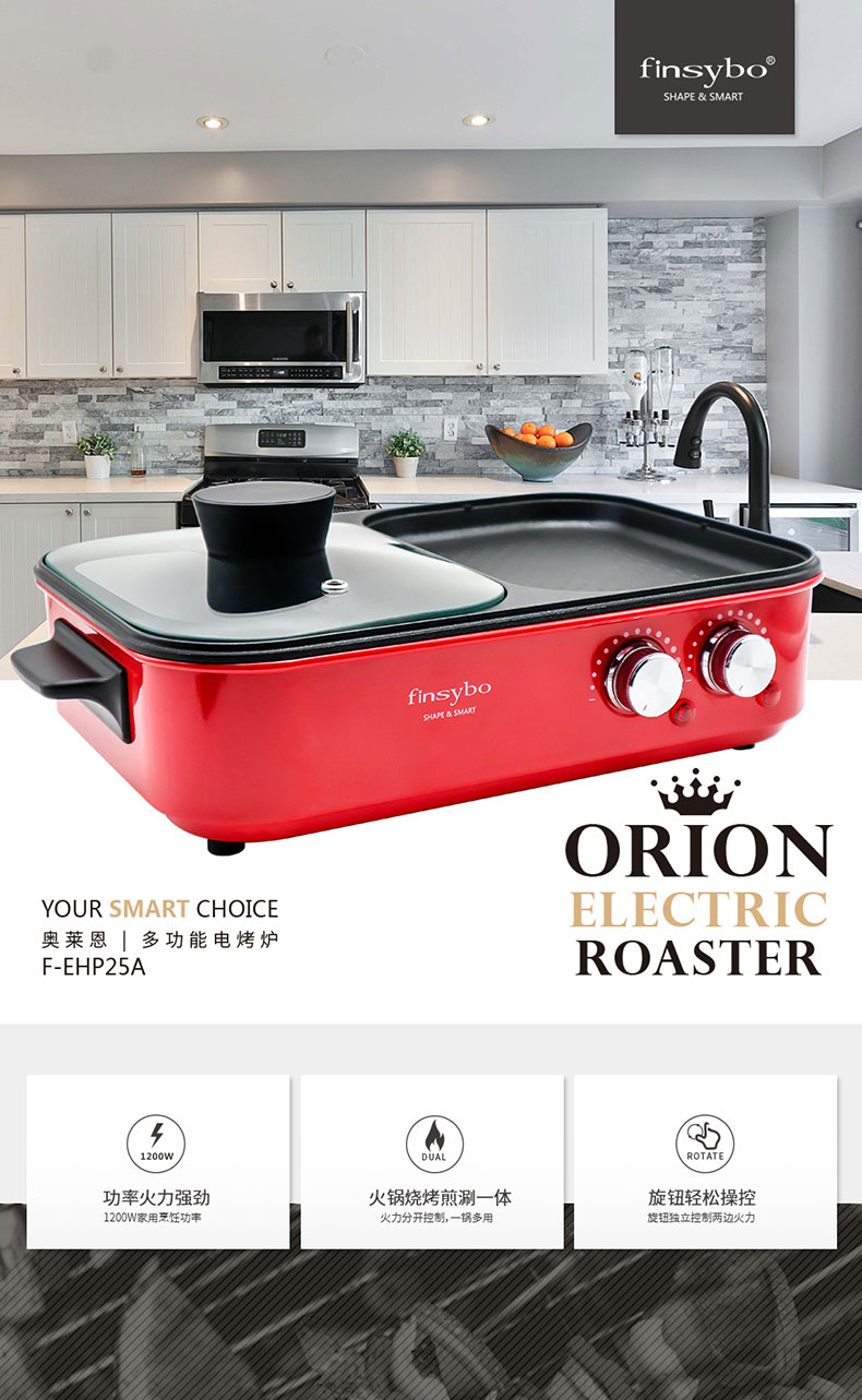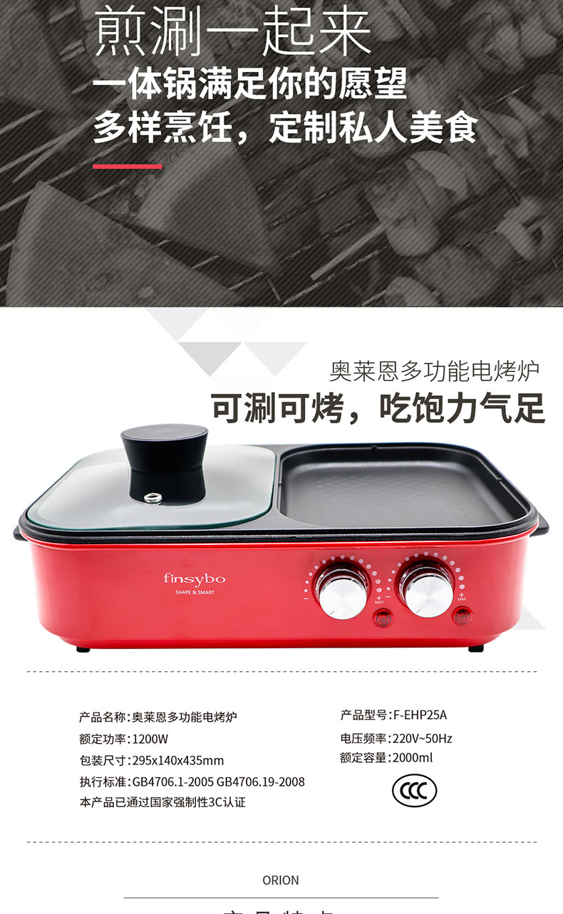 · 商品品牌:FINSYBO 英国阿诺尔 · 商品毛重:3.0kg · 商品型号:F-EHP25A · 商品类别:烤涮一体炉 · 适合人群:3-5人 · 清洗方式:一体机 · 适用场景:家庭使用 · 额定功率:1200W · 电压频率:220V~50Hz · 额定容量:2000ml · 包装尺寸:295X140X435mm