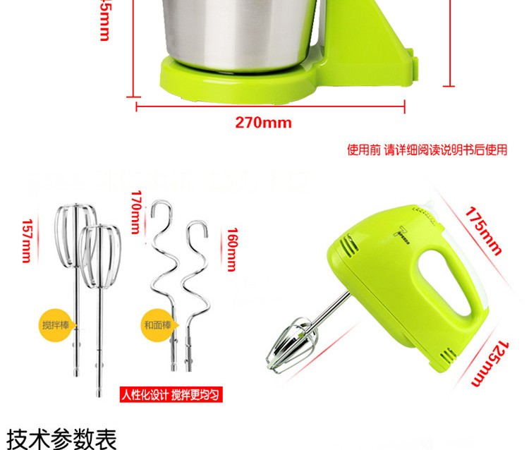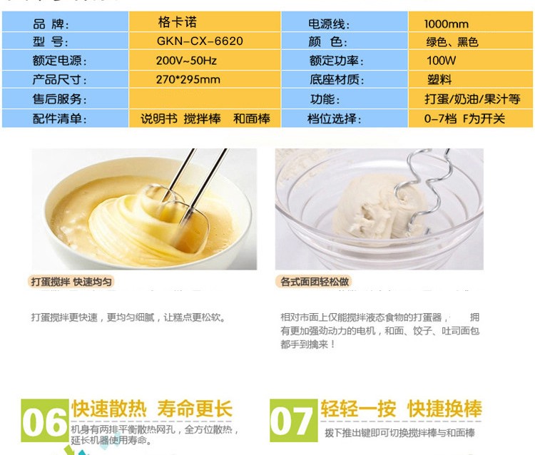• 商品品牌: 格卡诺(GKN) • 商品型号: GKN-CX-6620 • 商品毛重:1.0kg • 商品产地:中国大陆 • 商品类型:台式 • 功率:150W以下 • 打蛋棒类型:不规则线状 • 搅拌盆容量:0-2L • 料理功能:打蛋 • 搅拌盆材料:不锈钢 • 机身材料:塑料材质 • 搅拌棒材料:不锈钢