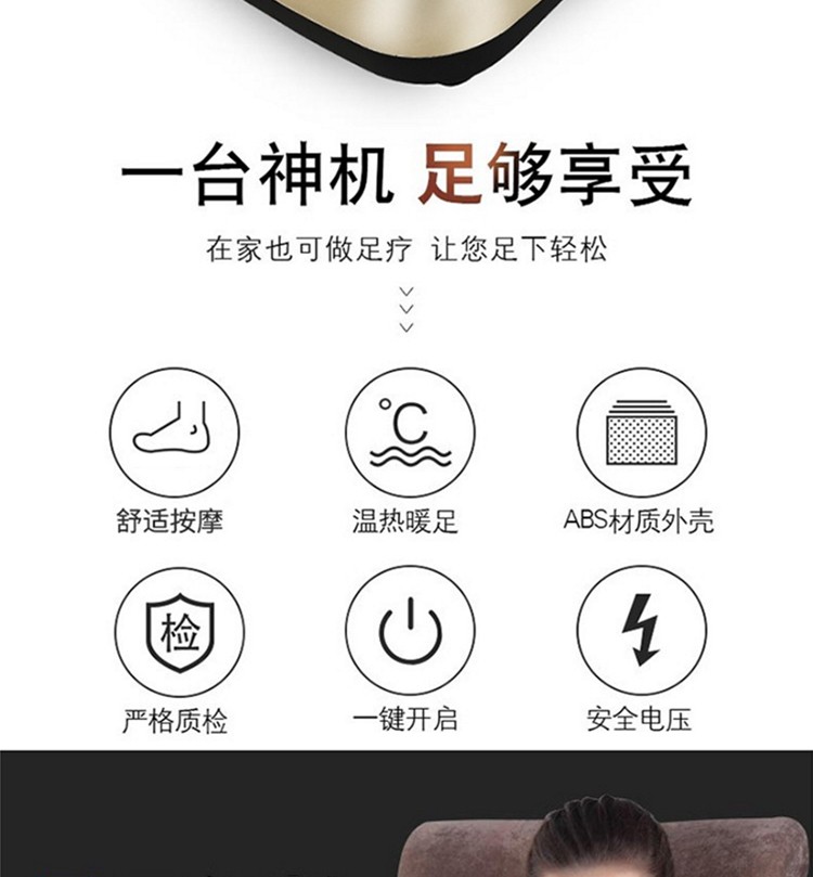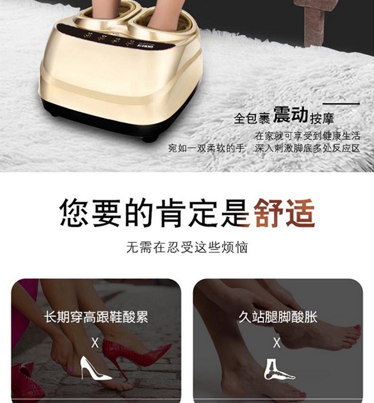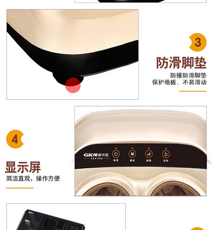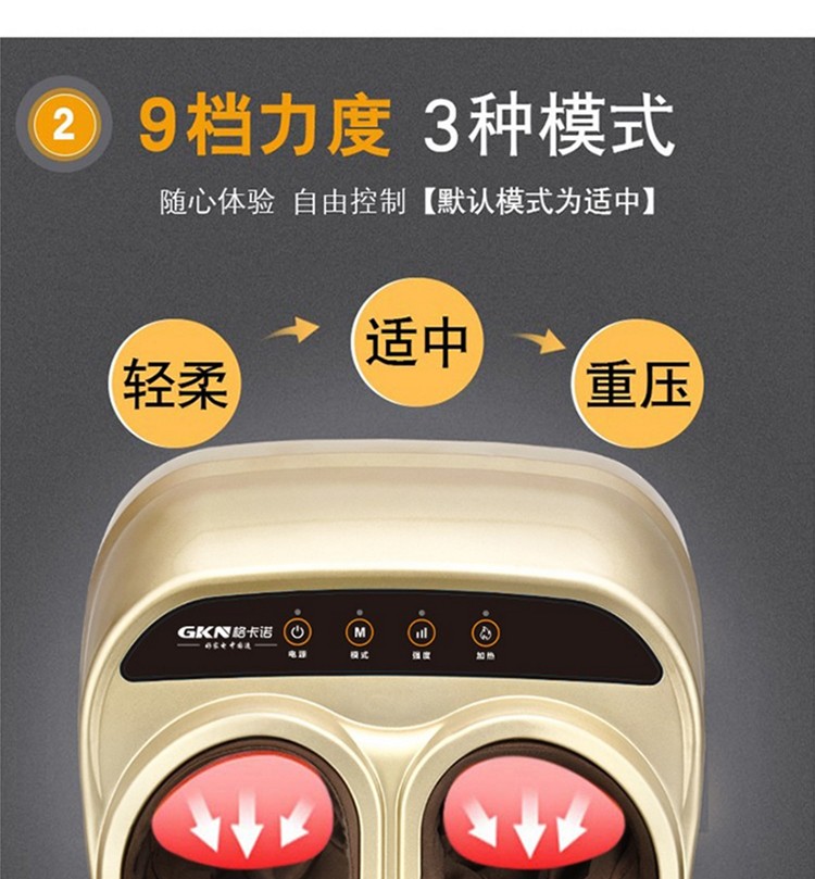• 商品品牌: 格卡诺(GKN) • 商品型号:GKN-JB-502 • 商品毛重:3.0kg • 商品产地:中国大陆 • 特色功能:遥控操作 • 适用部位:足底 • 按摩方式:揉捏,定穴按摩,振动