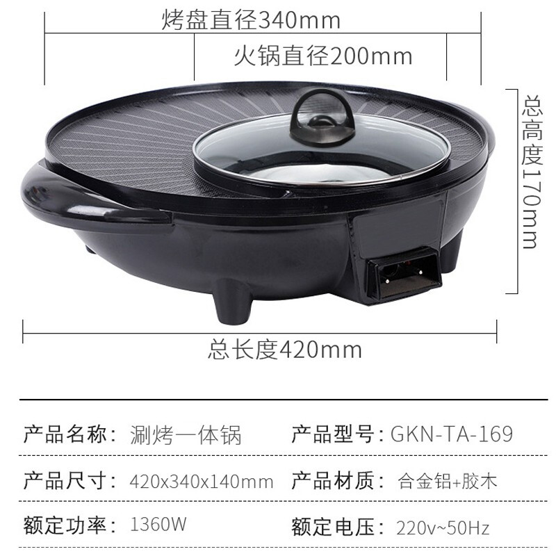 • 商品品牌: 格卡诺(GKN) • 商品型号: GKN-TA-169 • 商品毛重:4.0kg • 商品产地:中国大陆 • 商品层数:单层 • 清洗方式:一体机 • 适合人群:1-3人 • 商品类别:烤涮一体炉 • 适用场景:家庭使用