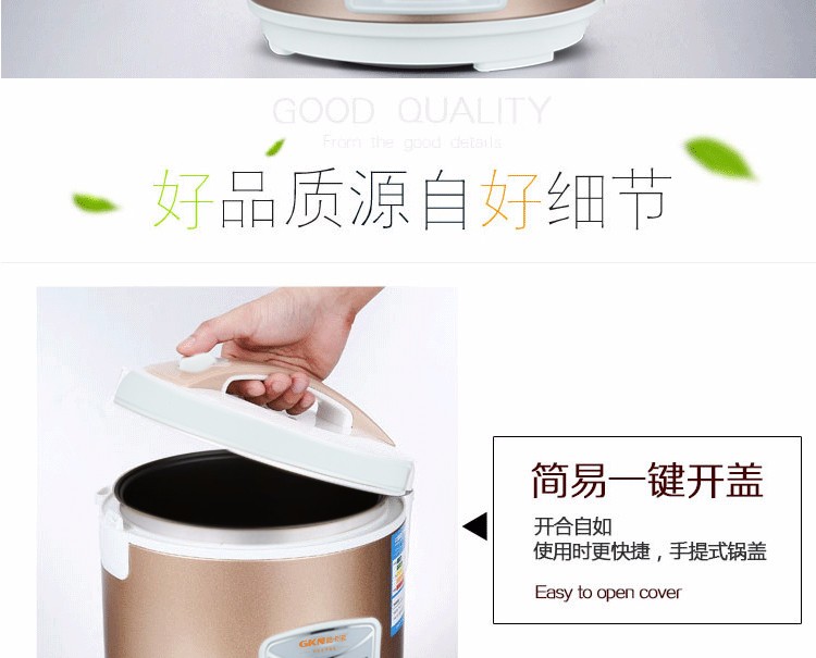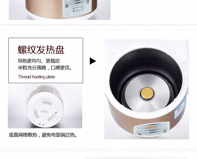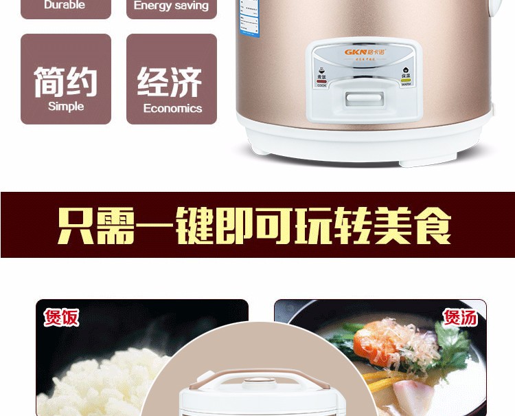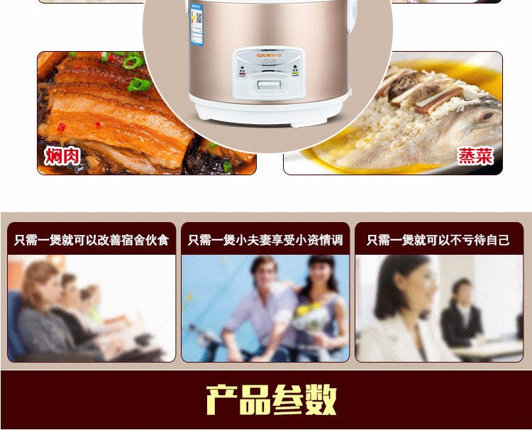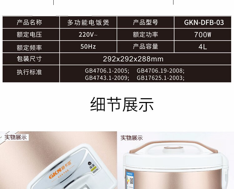 • 商品品牌: 格卡诺(GKN) • 商品型号: GKN-DFB-03 • 商品毛重:4.0kg • 商品产地:中国大陆 • 操控方式:机械式 • 加热方式:底盘加热 • 商品容量:3.1L-4L(2-5人) • 基础功能:蒸,粥/汤