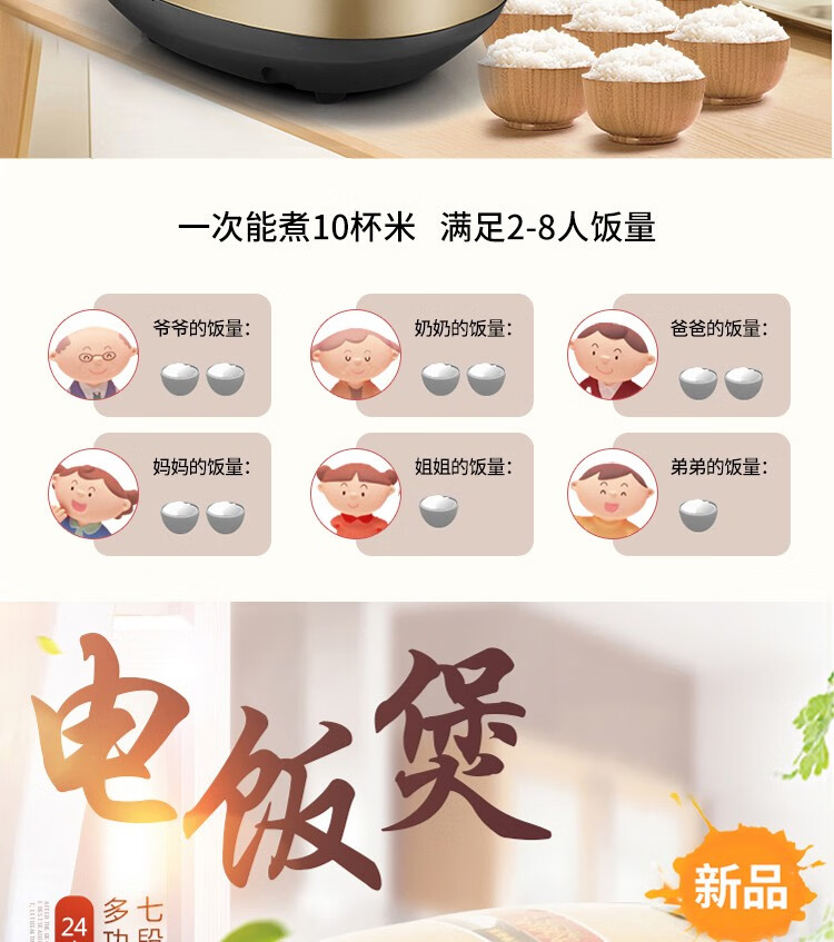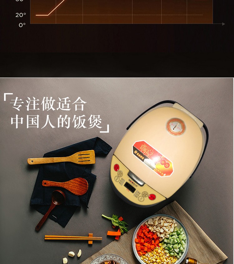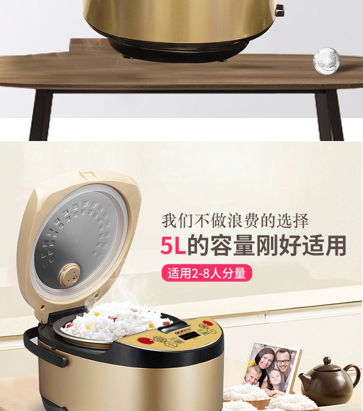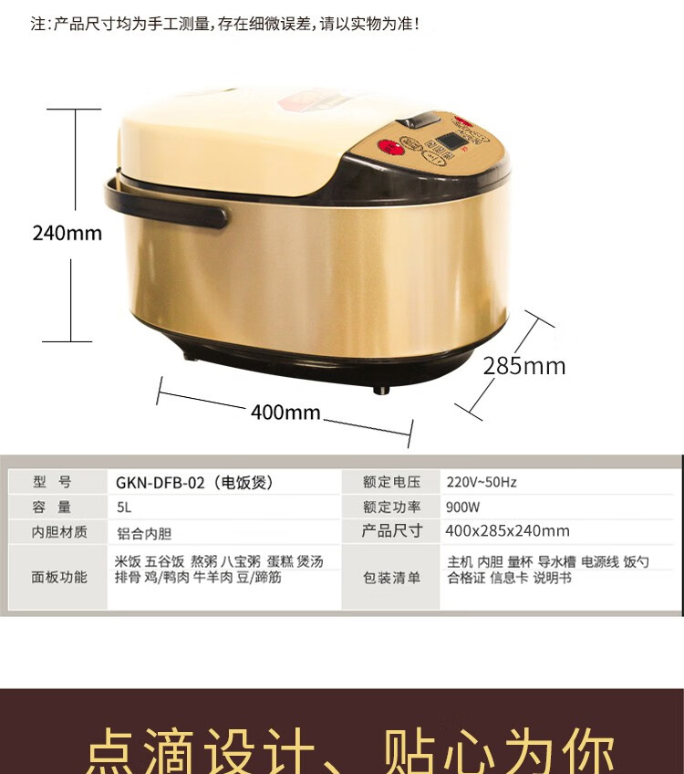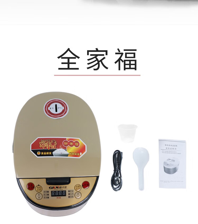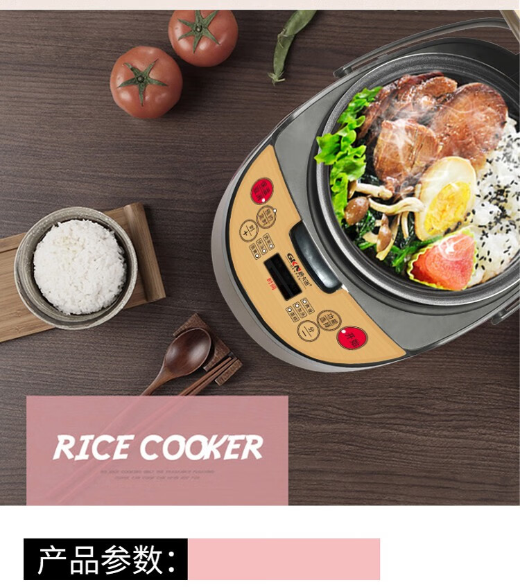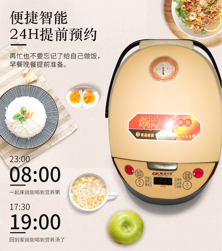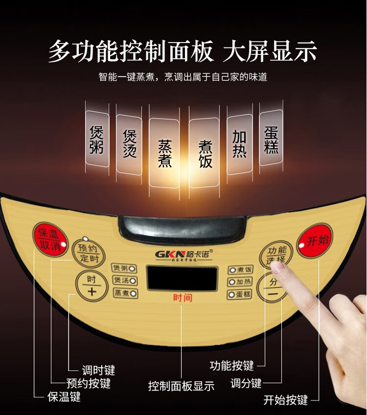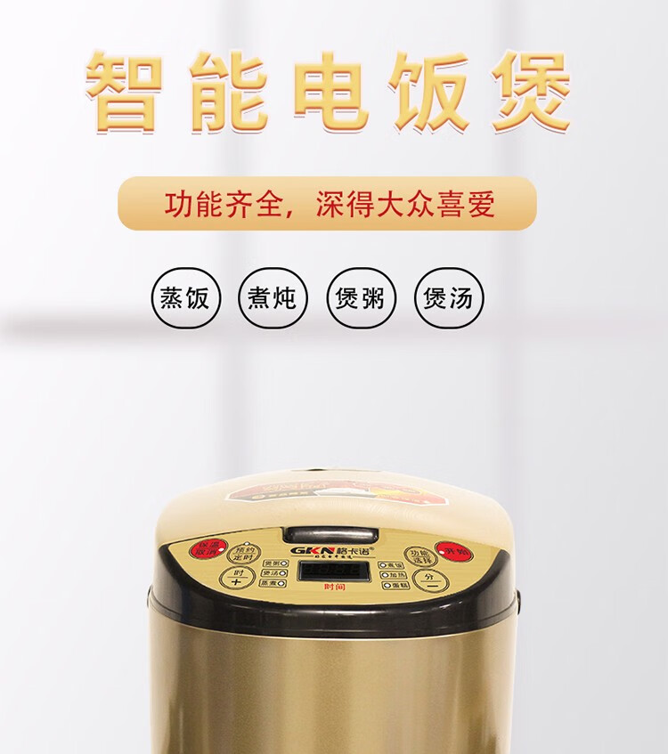 • 商品品牌: 格卡诺(GKN) • 商品型号: GKN-DFB-02 • 商品毛重:4.0kg • 商品产地:中国大陆 • 操控方式:按键式 • 加热方式:底盘加热 • 商品容量:4.1L-5L(2-8人) • 基础功能:蒸,稀饭,粥/汤