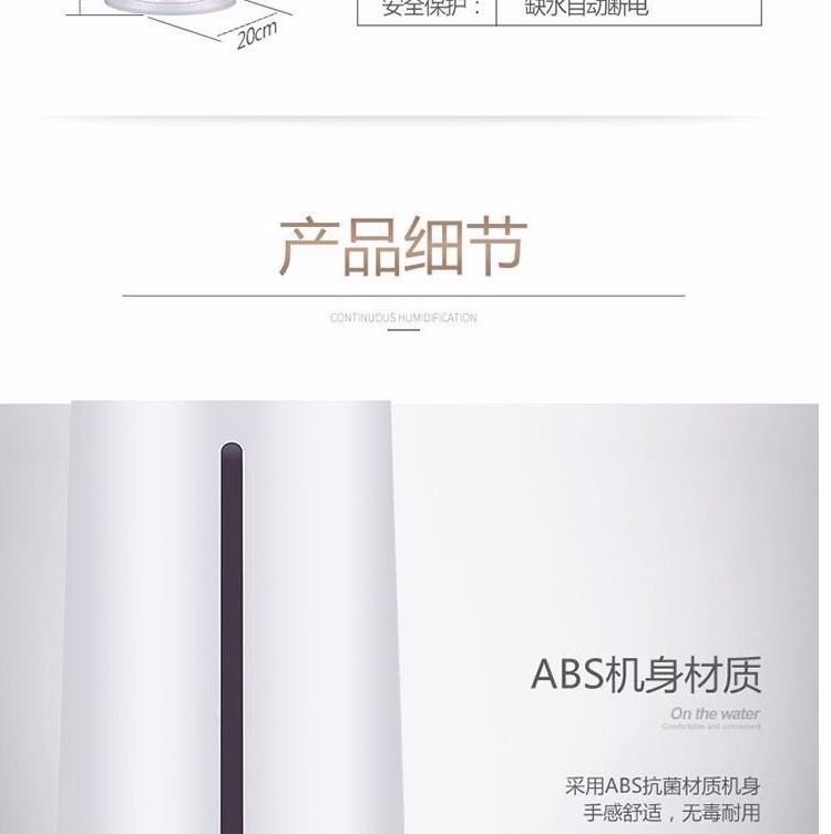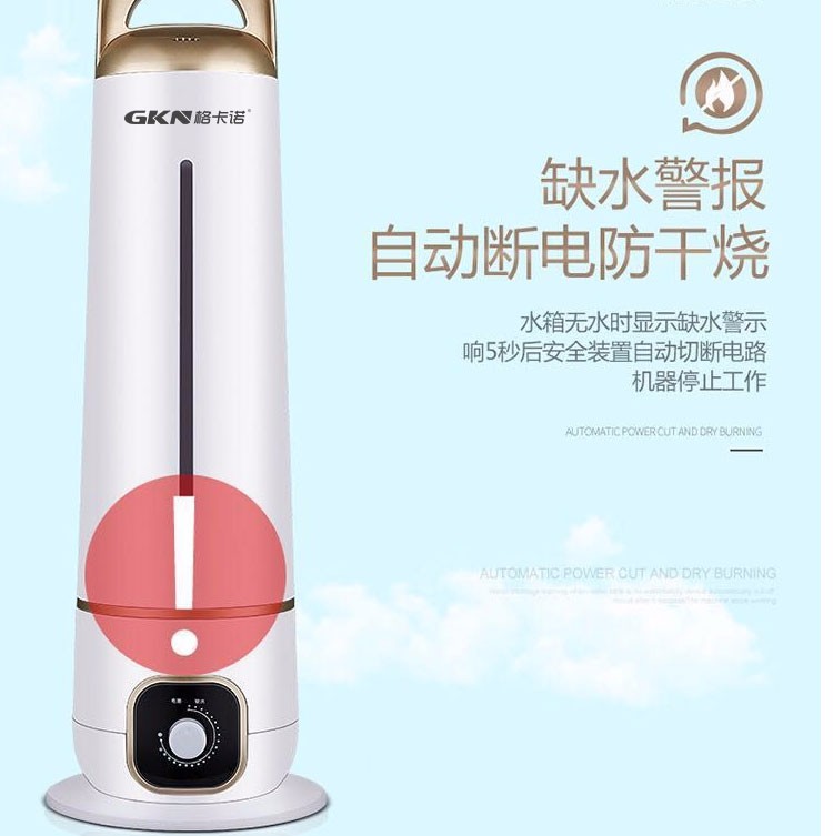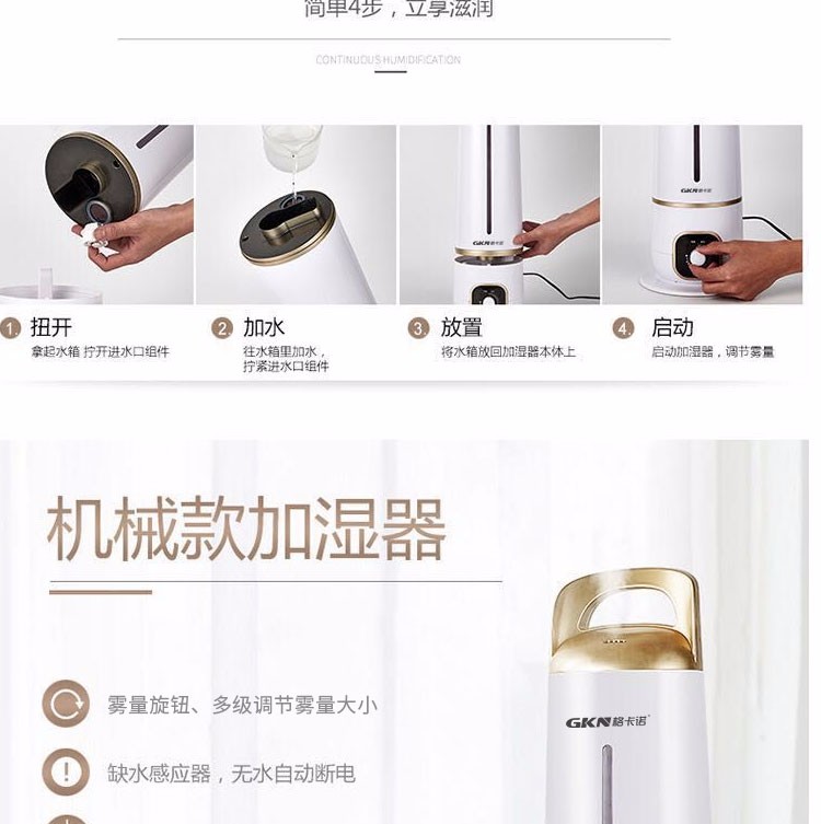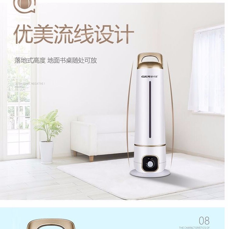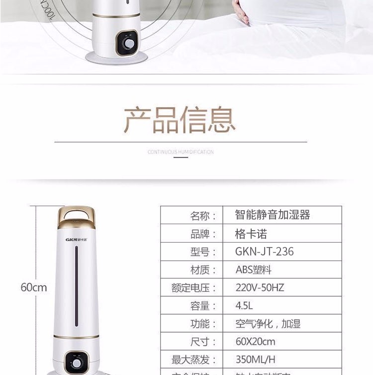 • 商品品牌: 格卡诺(GKN) • 商品型号:GKN-JT-236(圆柱款) • 商品毛重:5.0kg • 商品产地:中国大陆 • 商品类型:恒湿加湿型 • 适用场景:家用
