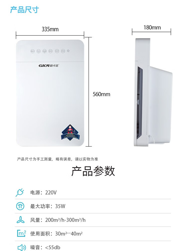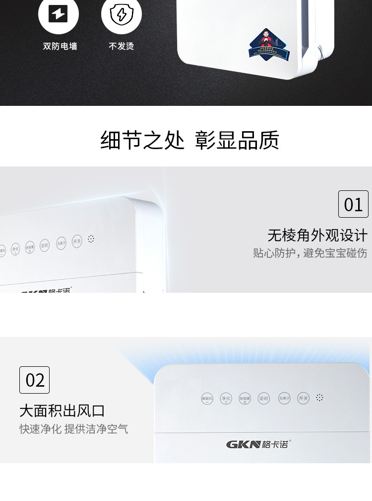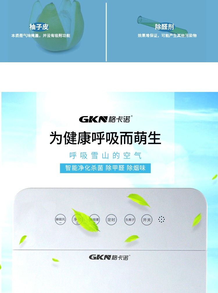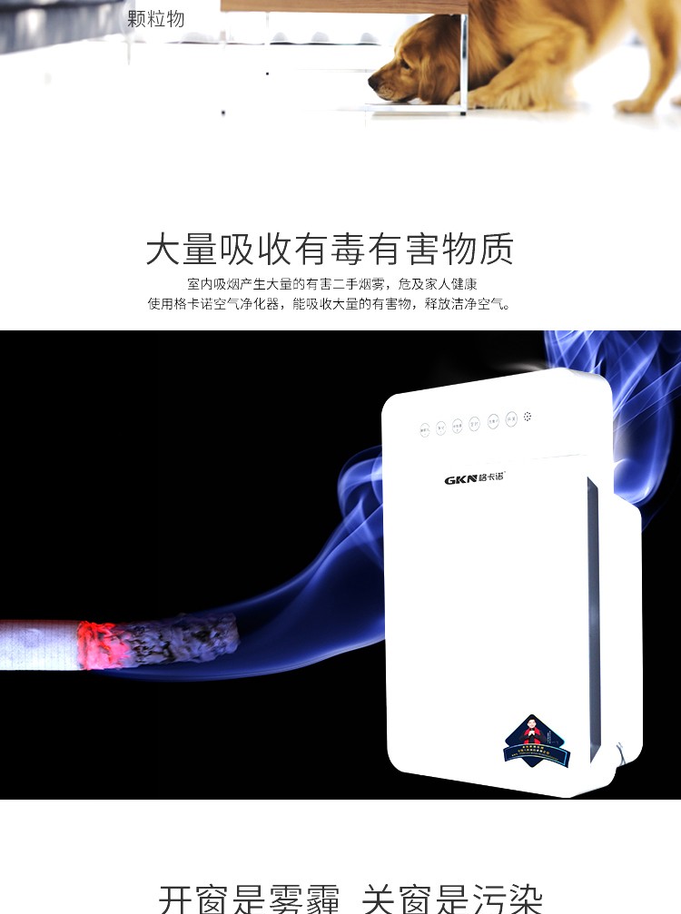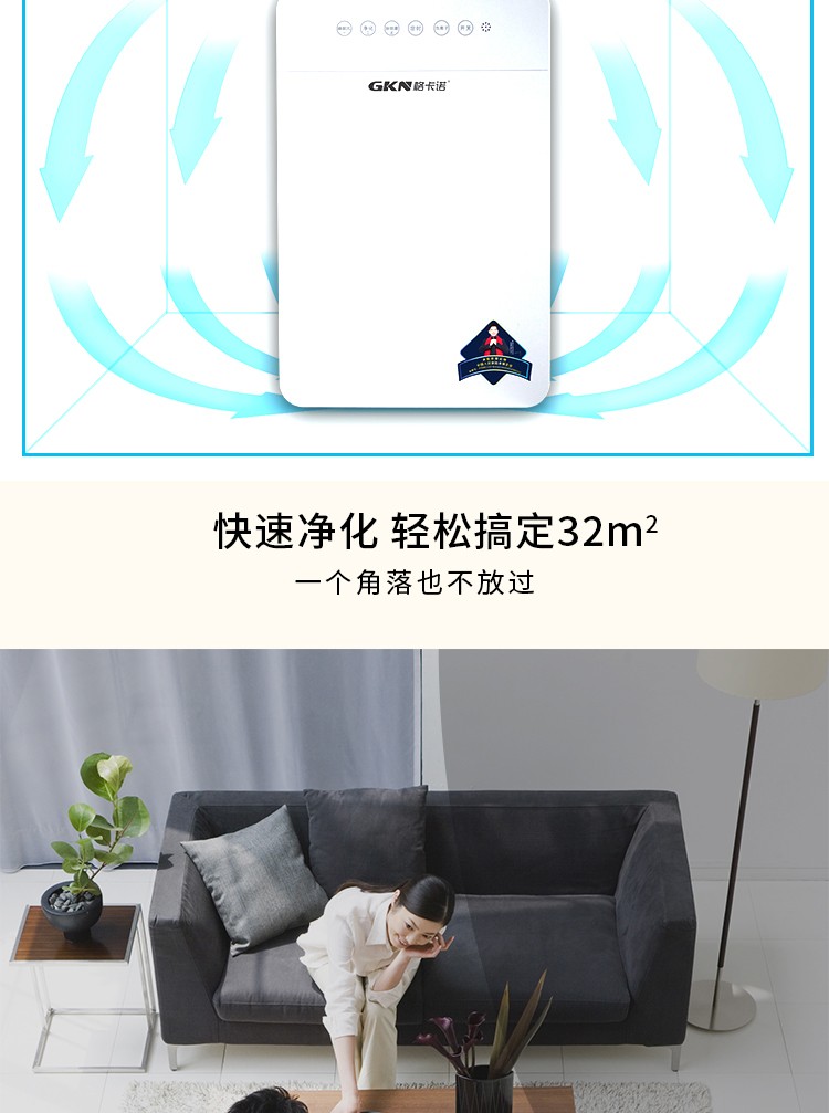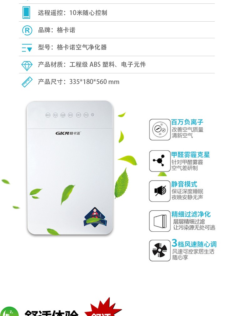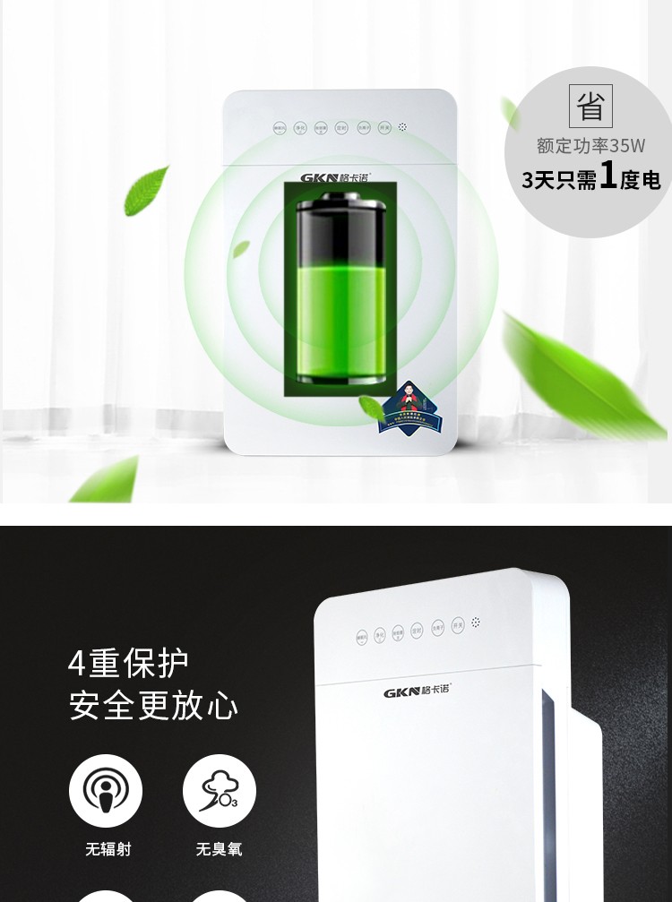 • 商品品牌:格卡诺(GKN) • 商品型号:GKN-KJ-B(六灯净化器) • 商品毛重:4.15kg • 商品产地:中国大陆 • 商品功能:除过敏原,除烟除尘,除花粉,负离子 • 商品类别:家用型 • 适用人群:家装人群