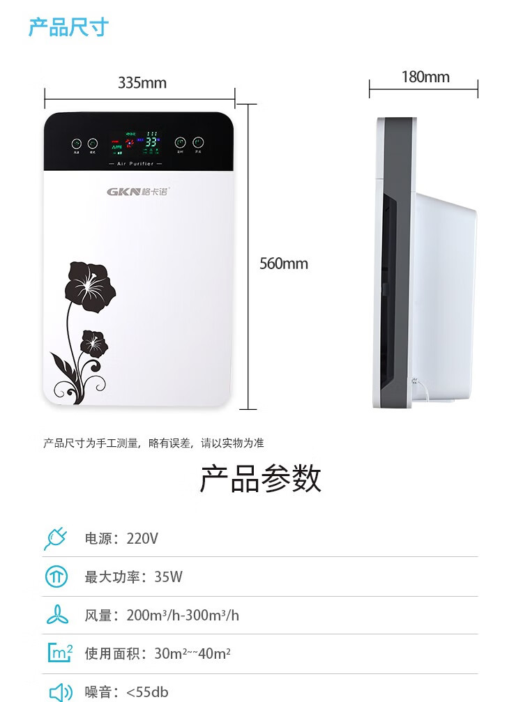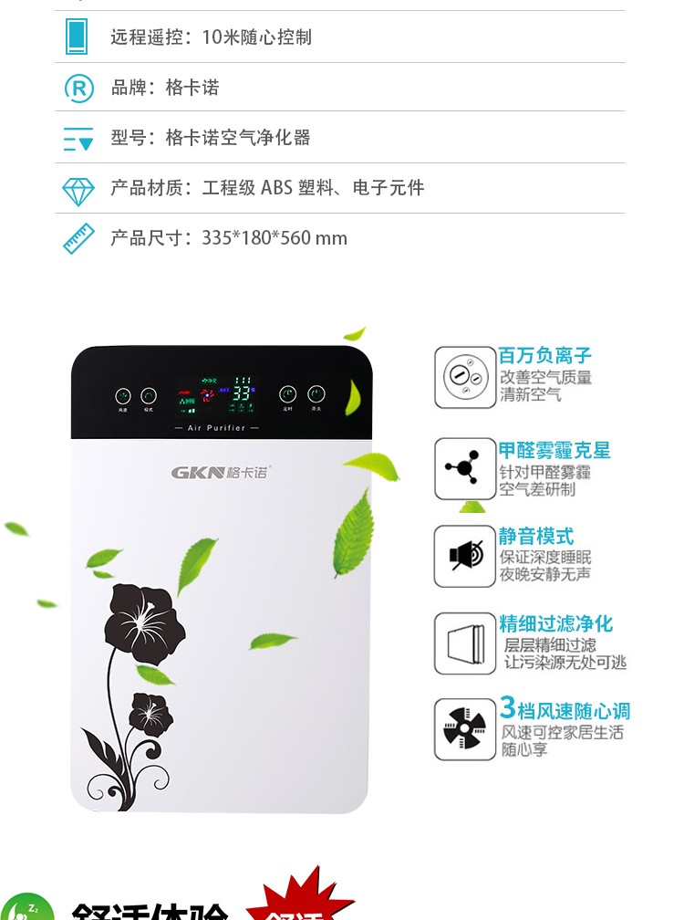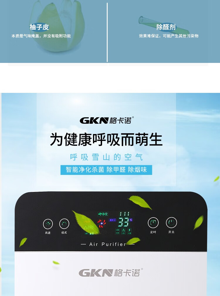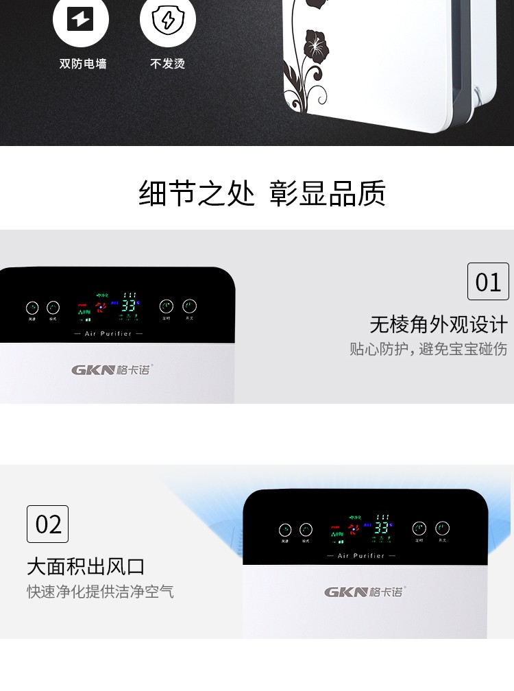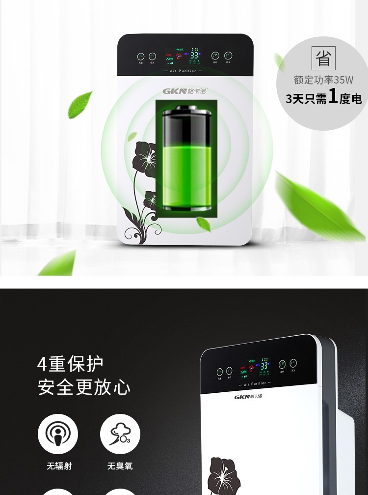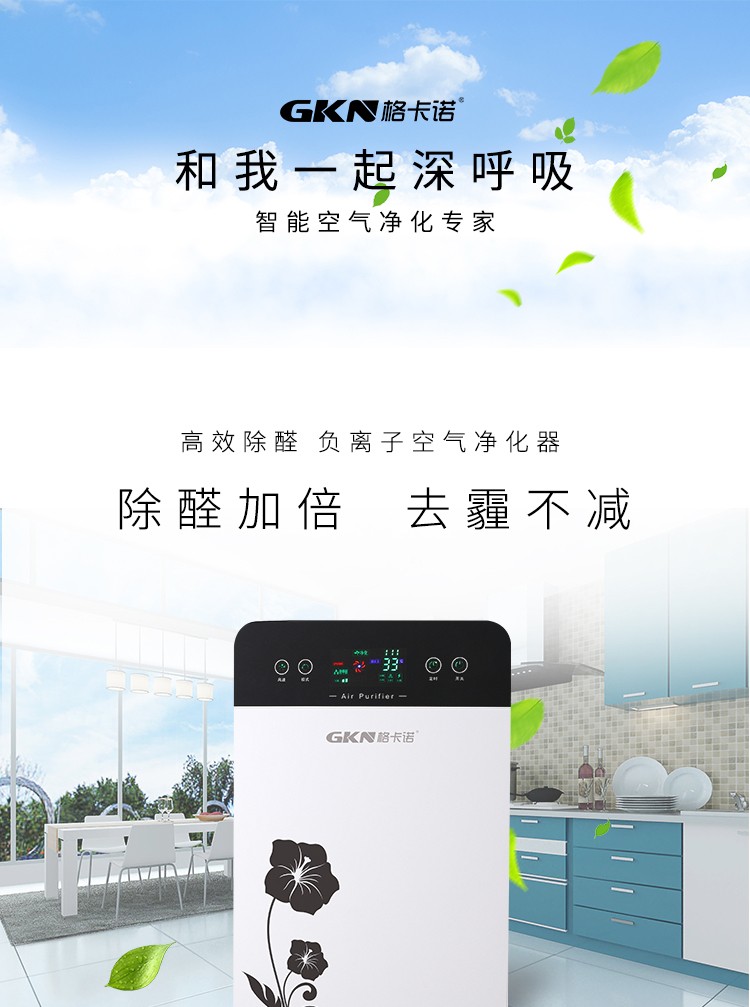 • 商品品牌: 格卡诺(GKN) • 商品型号:GKN-KJ-C • 商品毛重:5.0kg • 商品功能:除颗粒物,除异味,除过敏原,除烟除尘,除花粉,指数显示,负离子 • 商品类别:家用型 • 适用人群:家装人群