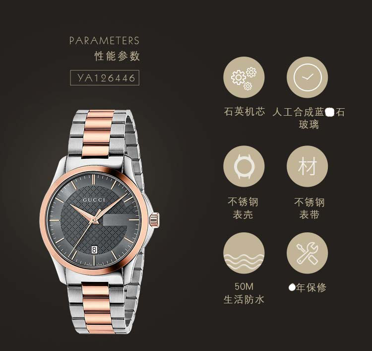 • 手表品怕:古驰(GUCCI) • 手表型号:YA126446 • 适用性别:男士 • 手表表带:其它 • 手表表盘:圆形 • 防水等级:50米防水 • 手表机芯:石英 • 表盘颜色:其它