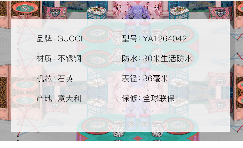 • 手表品牌:古驰(GUCCI) • 手表型号:YA1264042 • 手表毛重:1.00kg • 手表机芯:石英 • 适用人群:女士 • 手表表带:其它 • 防水等级:50米