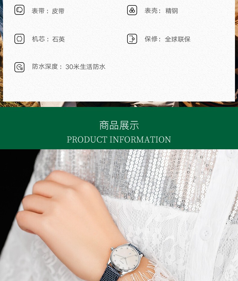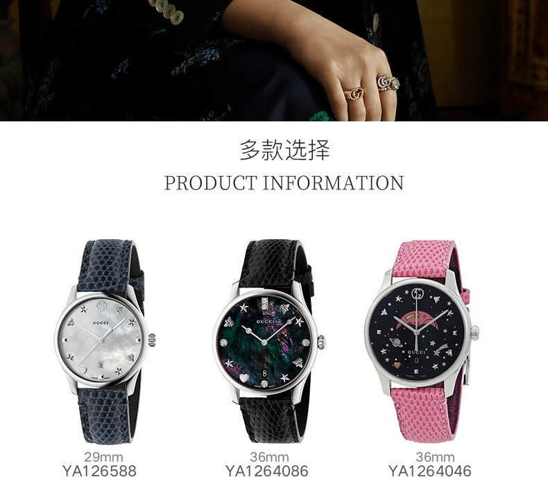• 手表品牌:古驰(GUCCI) • 手表型号:YA126588 • 手表表扣:针扣 • 手表表带:牛皮 • 表盘形状:圆形 • 手表机芯:石英 • 适用人群:女士 • 手表表径:29-35mm • 手表风格:商务,休闲风,时尚 • 防水等级:50米 • 手表表底:不透底 • 手表表壳:不锈钢