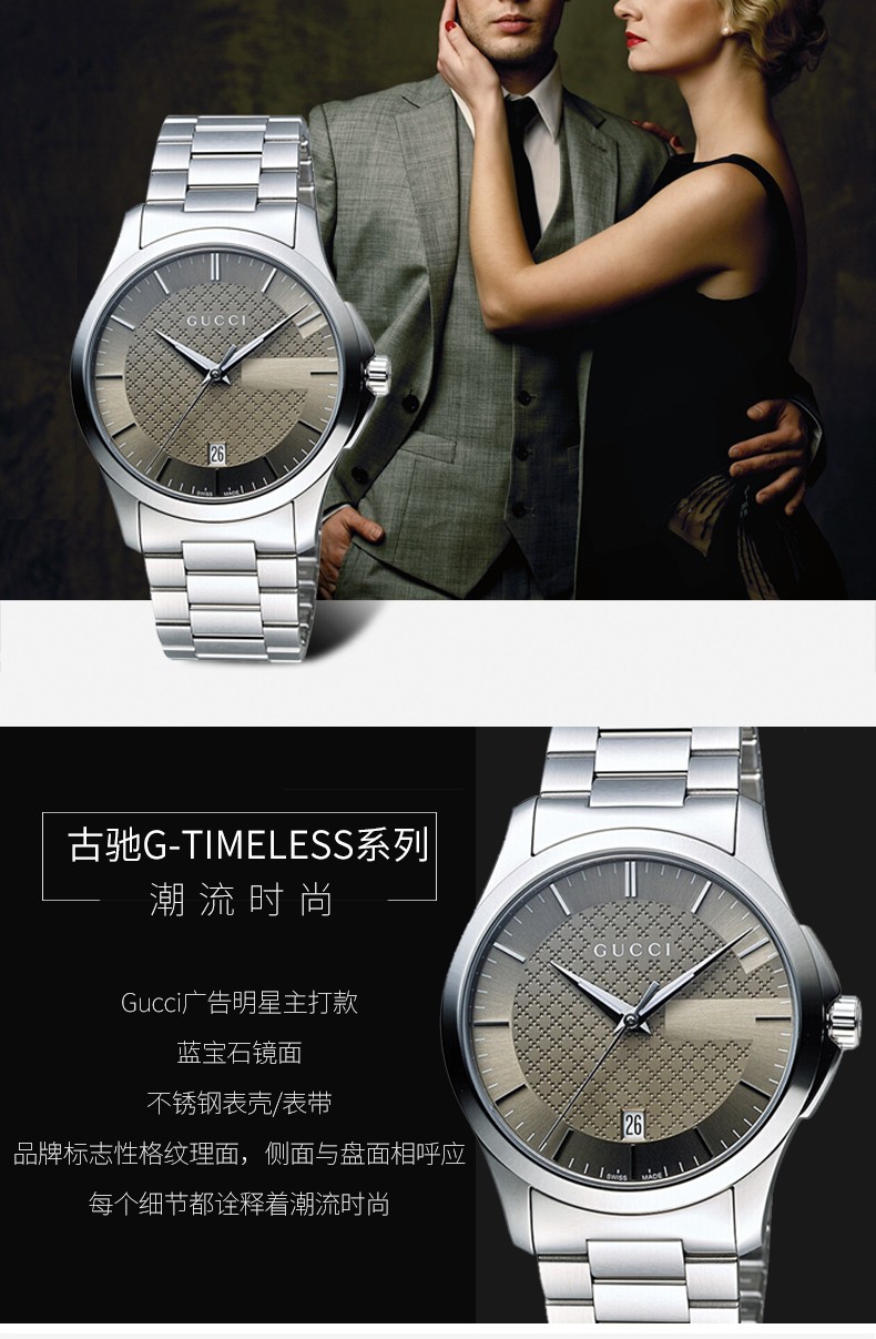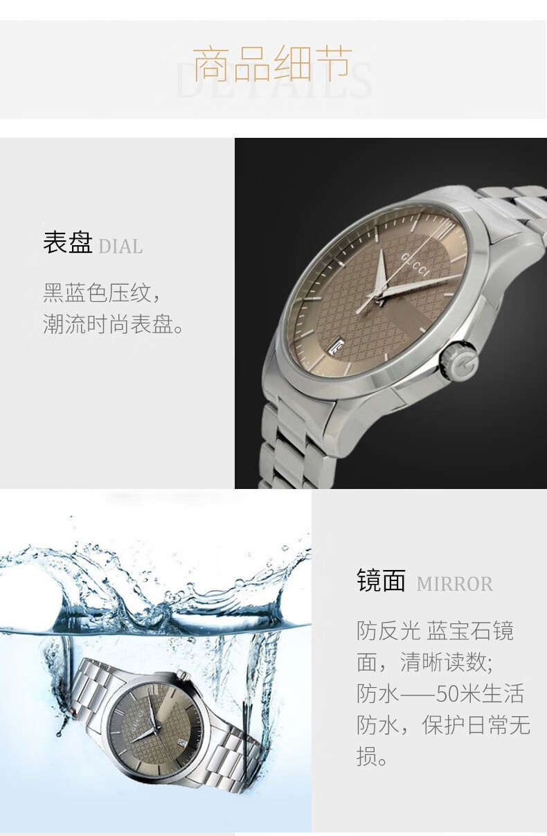 • 手表品牌:古驰(GUCCI) • 手表型号:YA126445 • 手表毛重:2.0kg • 手表机芯:石英 • 适用人群:中性 • 手表风格:商务,休闲风,运动风,时尚 • 防水等级:生活防水 • 手表表带:不锈钢 • 手表功能:大三针