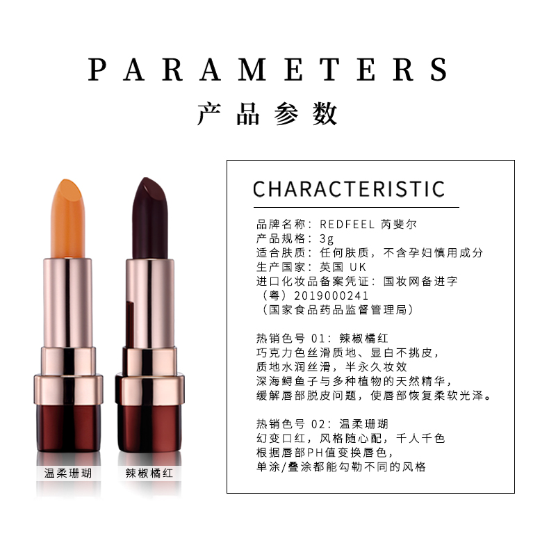 · 商品品牌: REDFEEL 英国芮斐尔 · 商品产地: 英国 · 净含量: 3g · 商品功效: 提升气色、滋润、保湿、防水 · 规格类型: 正常规格 · 是否为特殊用途化妆品: 否 · 产品类别: 进口 · 5化妆品保质期: 36个月
