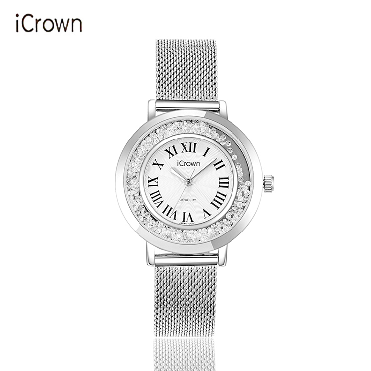 艾克朗icrown 女表外径36mm真皮防水潮流时尚锆石手工镶嵌手表型号71162S-白金网带