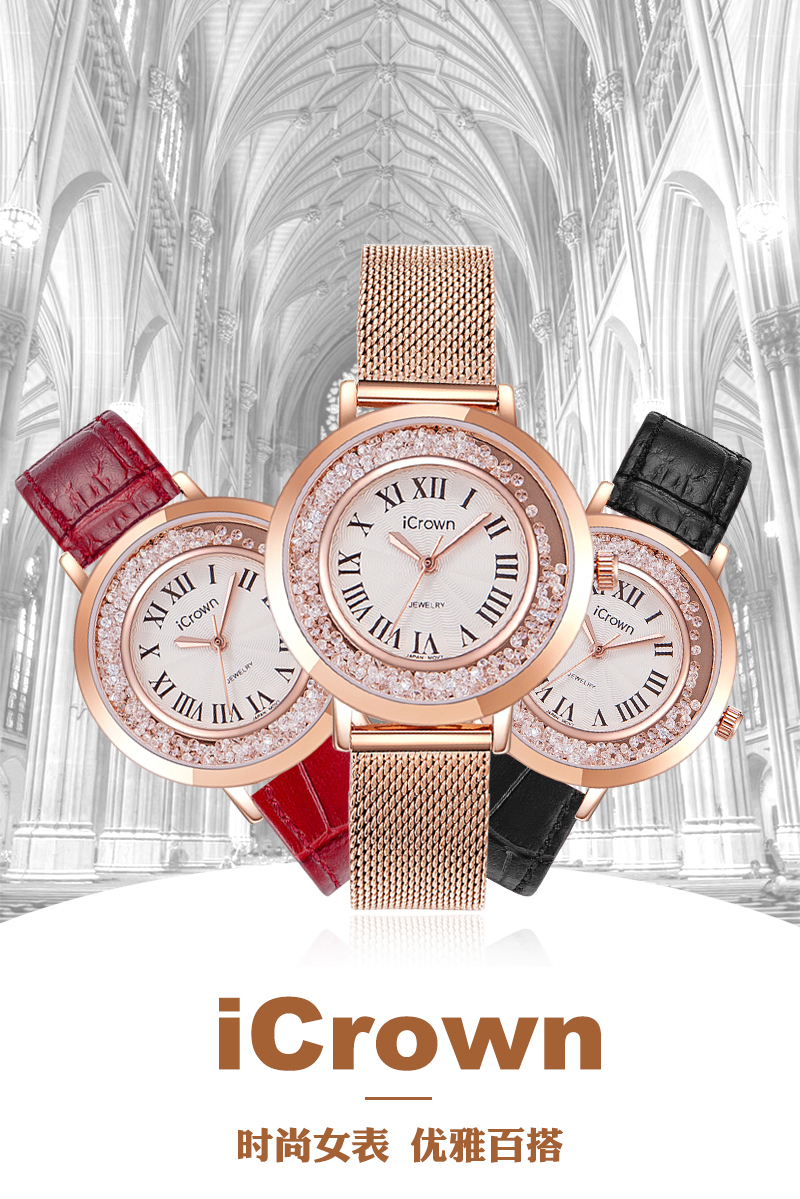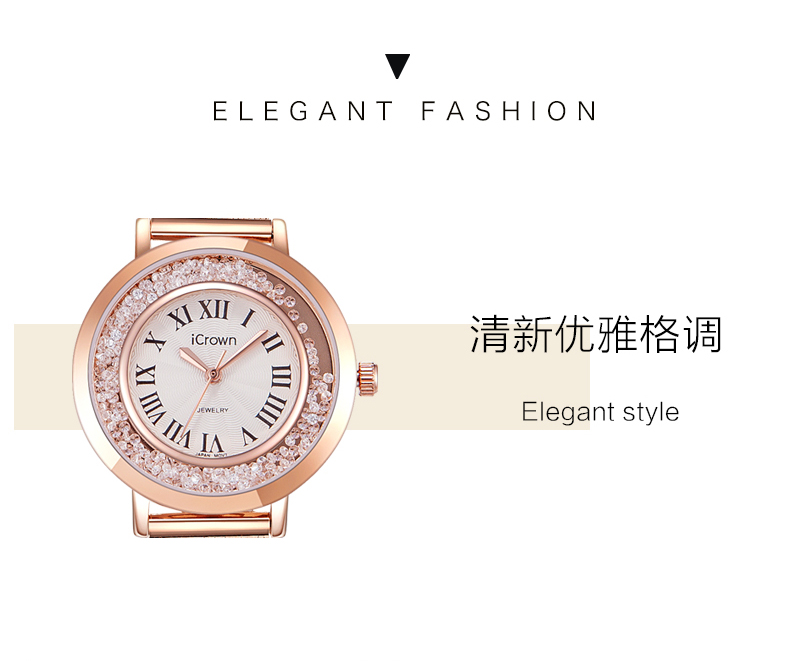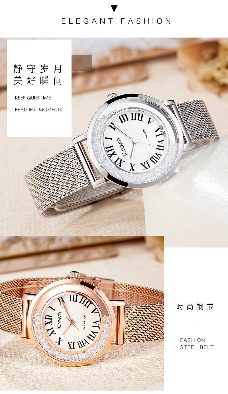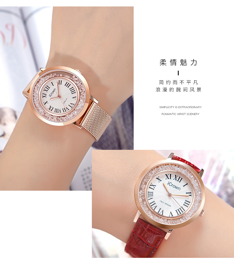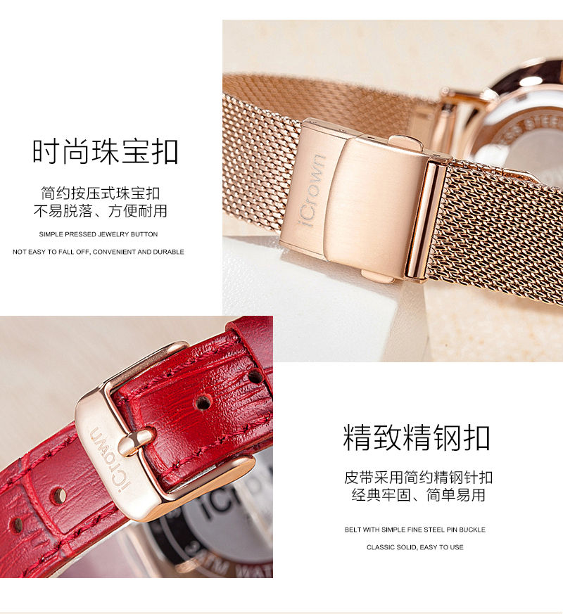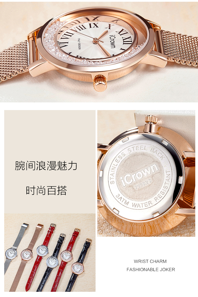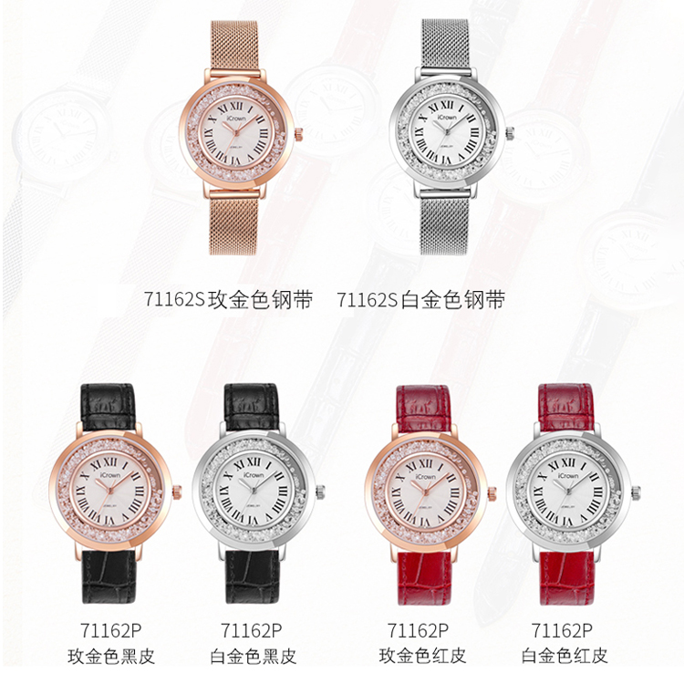 • 手表品牌: 艾克朗iCrown • 手表型号:71162P • 手表毛重:400.00g • 手表机芯:石英 • 适用人群:女士 • 手表风格:商务,休闲风,时尚,极简,可爱 • 防水等级:30米 • 手表表带:其它