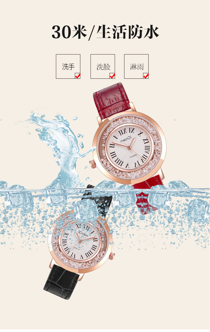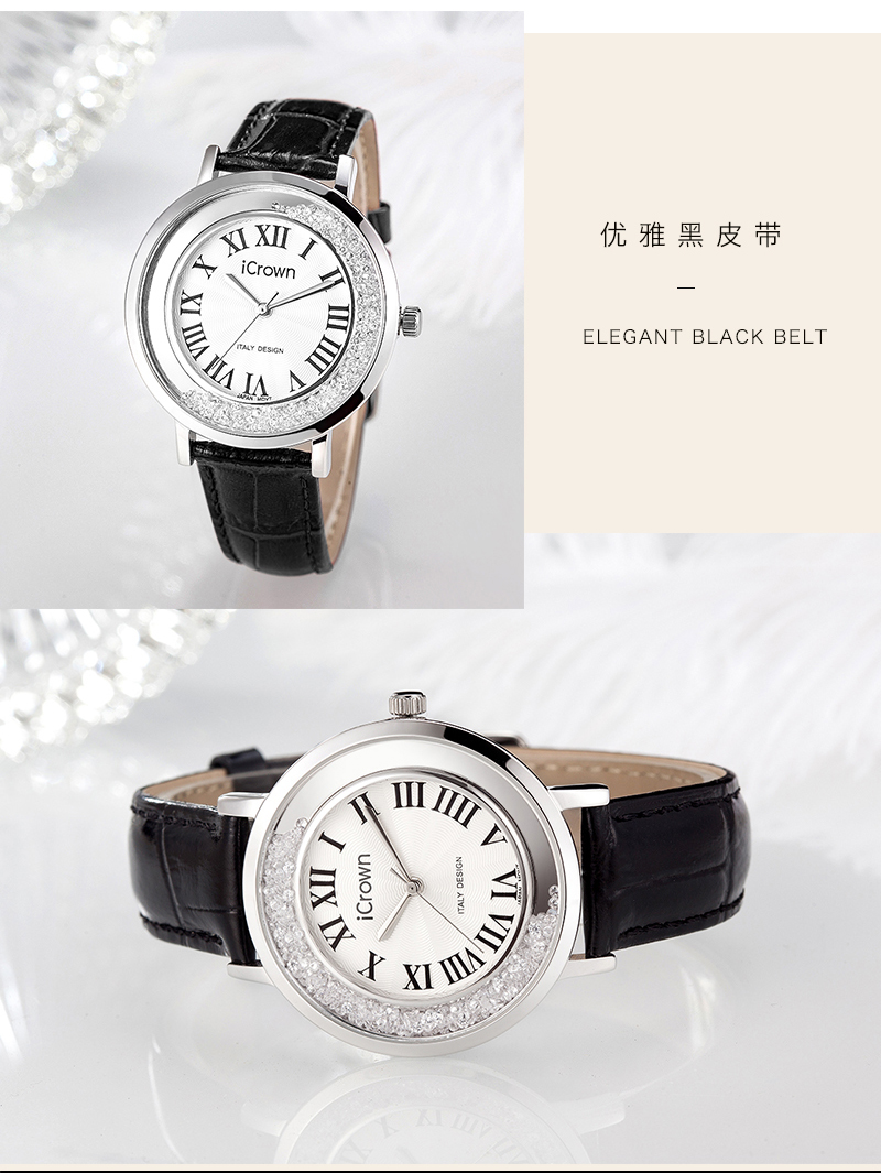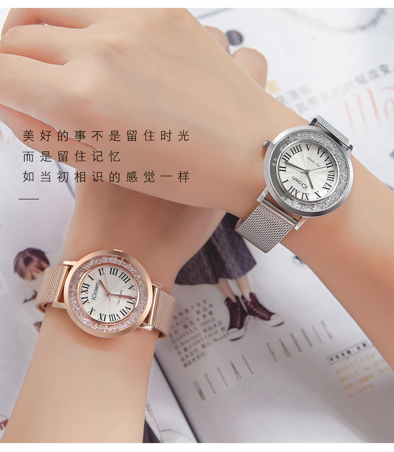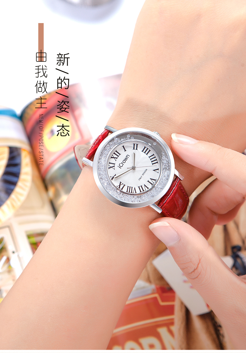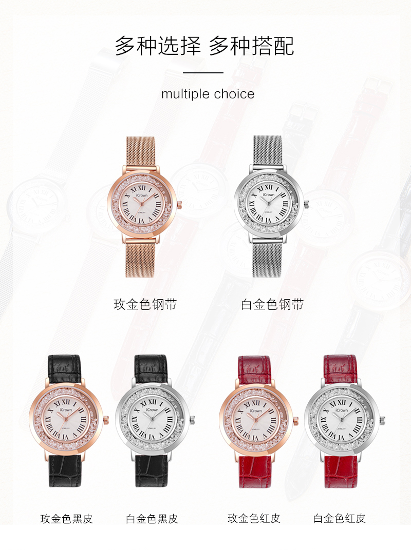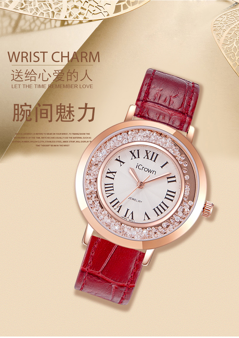 • 手表品牌: 艾克朗iCrown • 手表型号:71162P • 手表毛重:400.00g • 手表机芯:石英 • 适用人群:女士 • 手表风格:商务,休闲风,时尚,极简,可爱 • 防水等级:30米 • 手表表带:其它