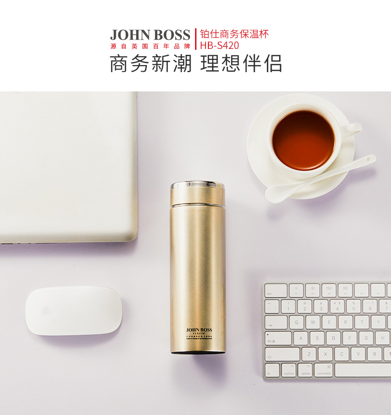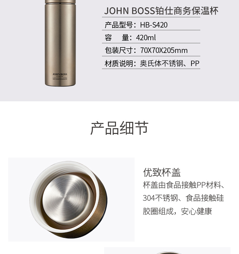 • 商品品牌: JOHN BOSS • 商品型号:HB-S420 • 商品毛重:350.00g • 商品产地:中国大陆 • 商品材质:不锈钢 • 商品容量:401-500ml • 保温时长:6-12小时 • 商品类型:直身杯 • 适用场景:通用 • 国产/进口:国产