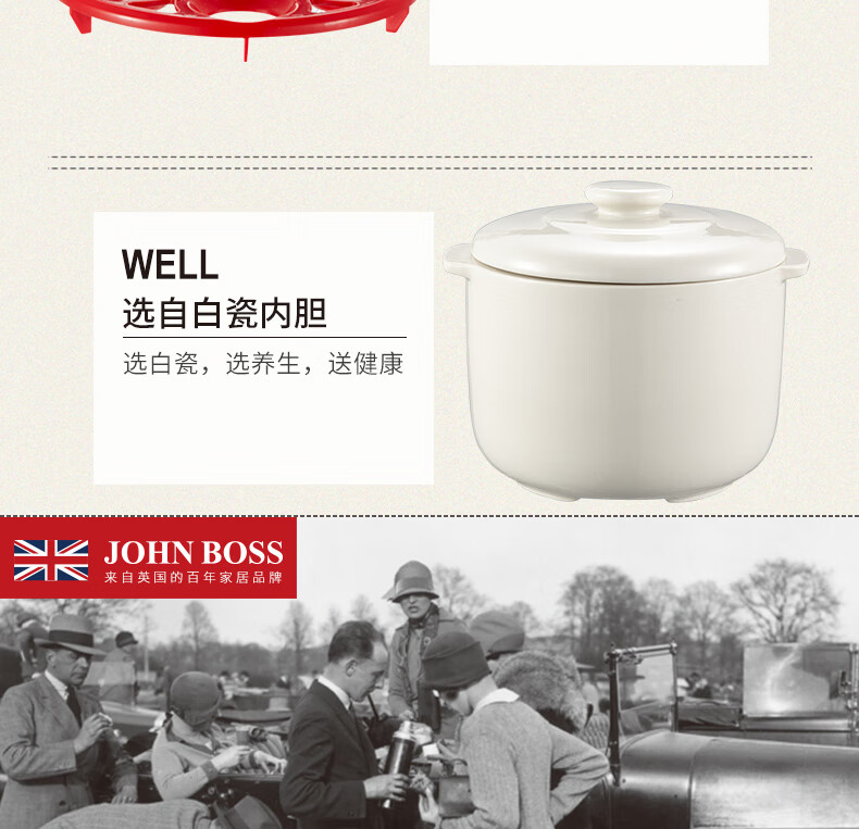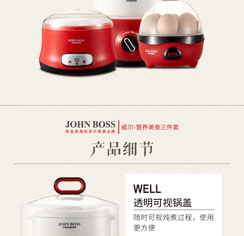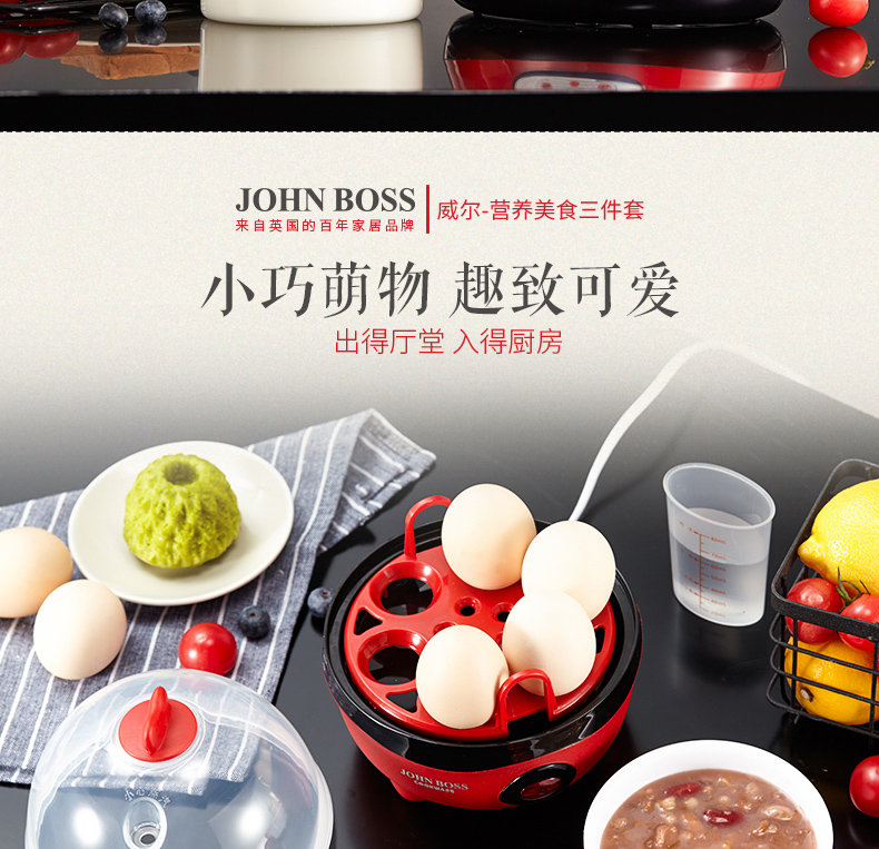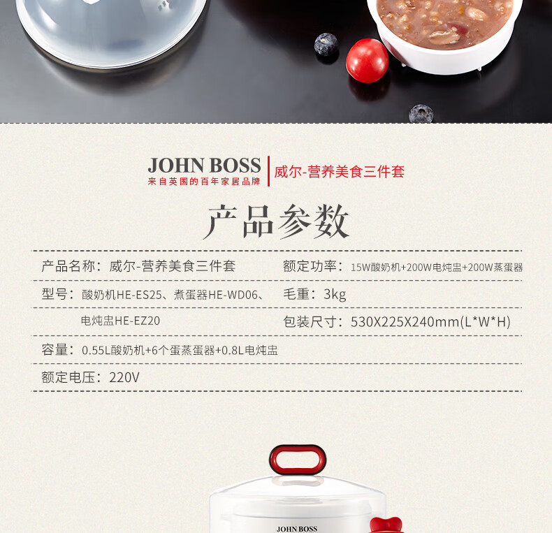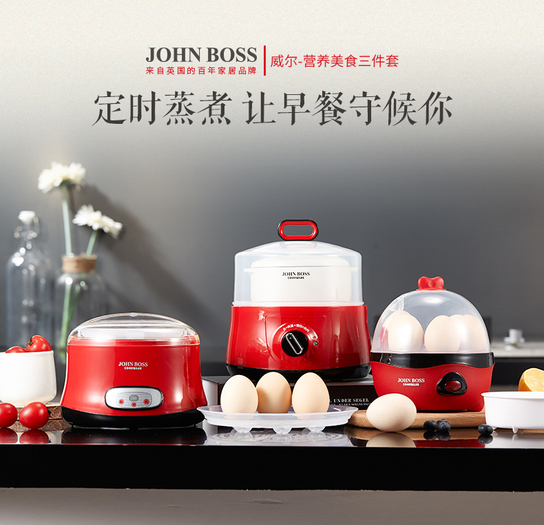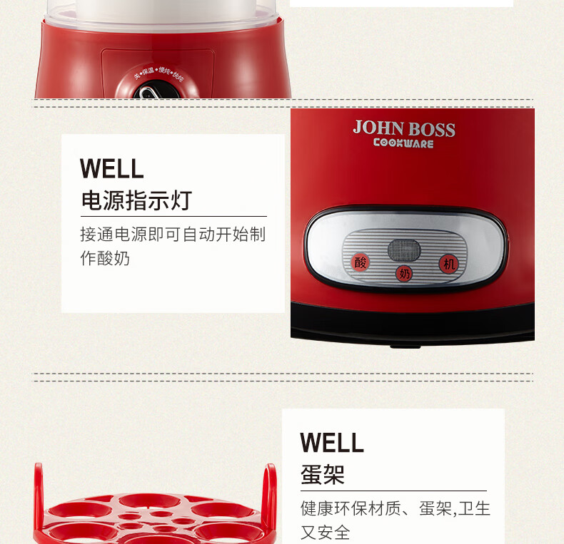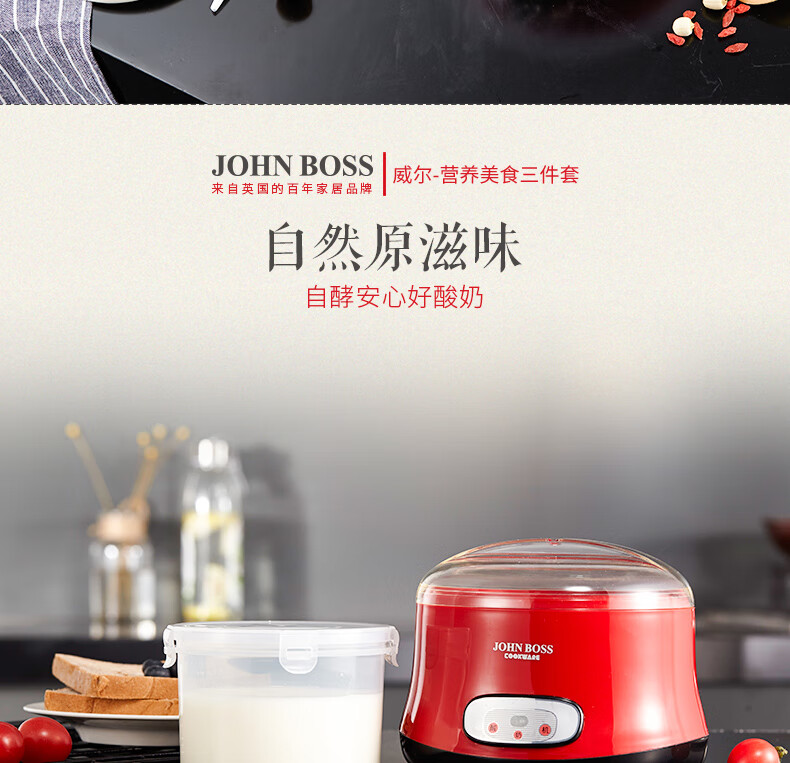 • 商品品牌: JOHN BOSS • 商品型号:三件套 HE-WD06/HE-EZ20/HE-ES25 红色 • 商品毛重:3.0kg • 操控方式:机械式 • 商品容量:1L以下 • 内胆材质:陶瓷 • 商品功能:酸奶 • 适用场景:家用型 • 分杯数量:无分杯 • 发酵缸材质:其他