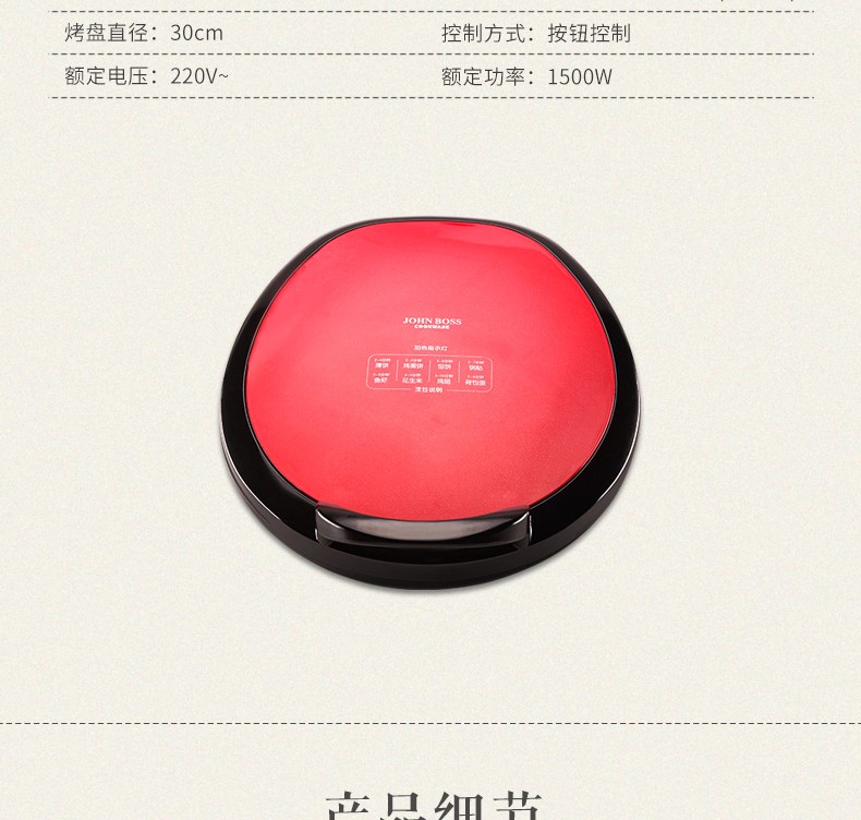 • 商品品牌: JOHN BOSS • 商品型号:HE-WB1500 红色 • 商品毛重:3.3kg • 商品产地:中国大陆