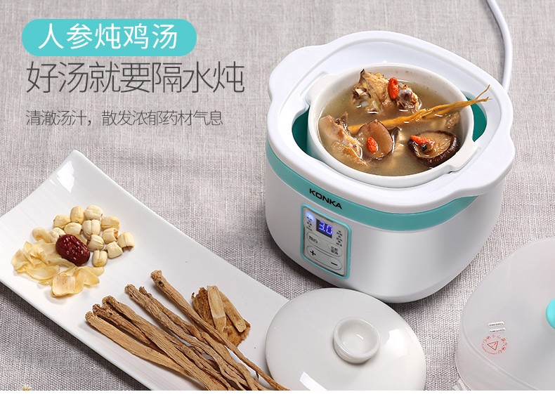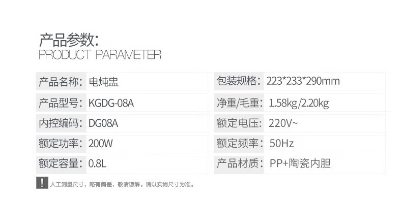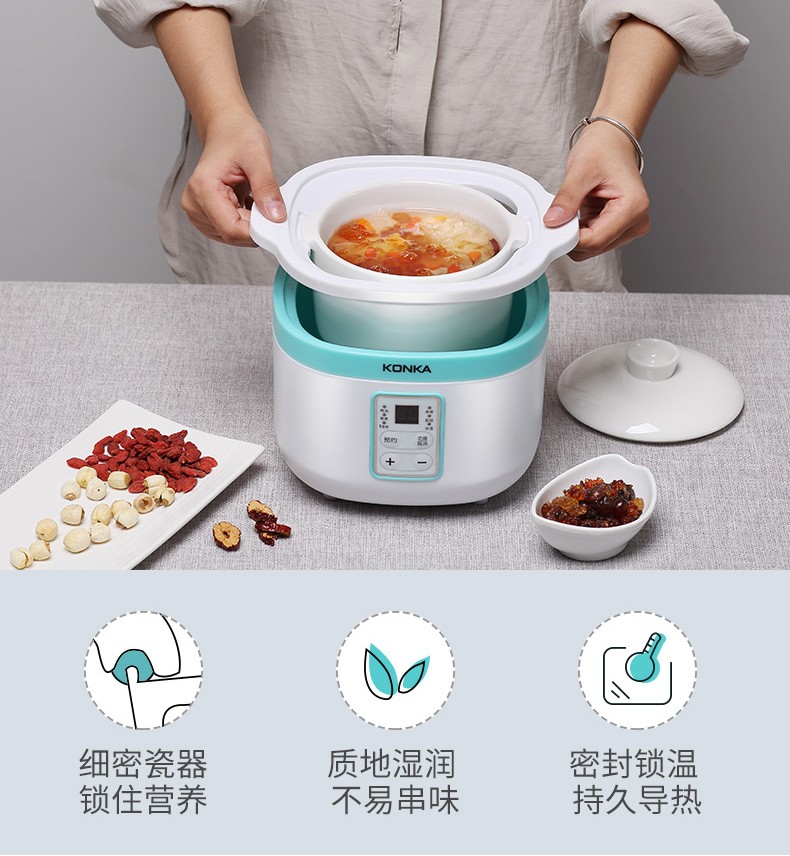 • 商品品牌: 康佳(KONKA) • 商品型号: DG08A • 商品毛重:2.2kg • 操控方式:机械式 • 内胆数量:1个 • 内胆容量:1L及以下 • 内胆材质:陶瓷