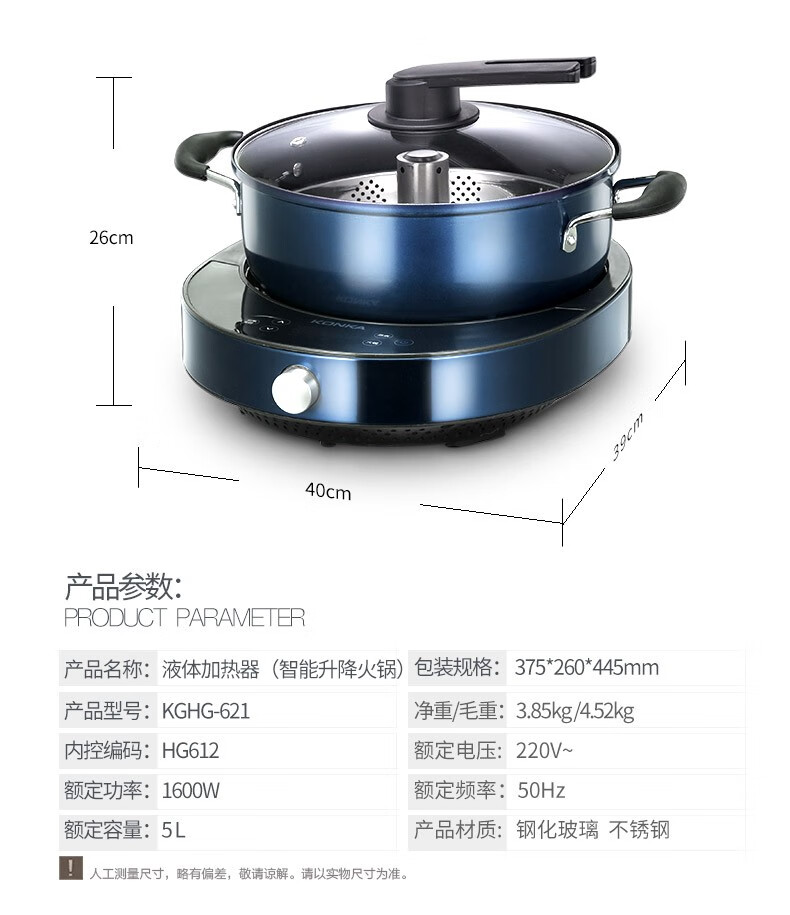 • 商品品牌: 康佳(KONKA) • 商品型号: HG612 • 商品毛重:4.52kg • 操控方式:触控式 • 商品类别:电火锅 • 商品容量:4.1L-6L • 蒸笼层数:无蒸笼 • 特色功能:无极控温,定时,定温