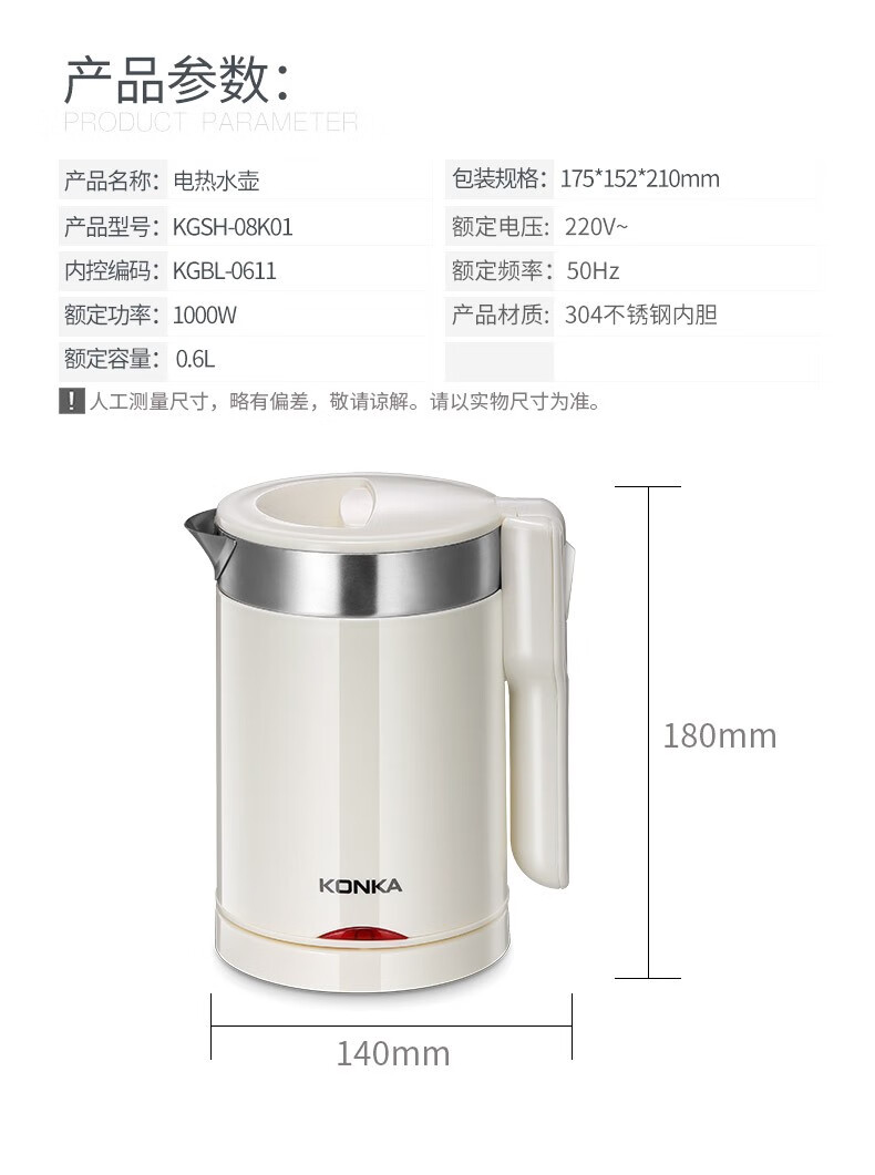 • 商品品牌: 康佳(KONKA) • 商品型号: KGBL-0611 • 商品毛重:1.23kg • 特色功能:保温 • 商品材质:食品级304不锈钢 • 商品容量:1L及以下 • 商品类别:电热水壶