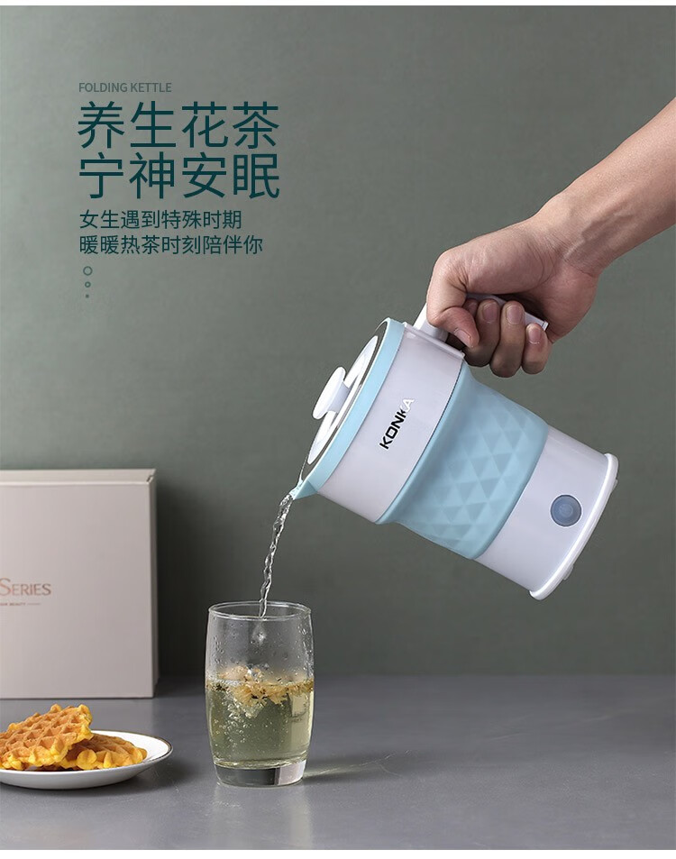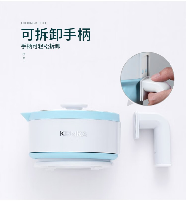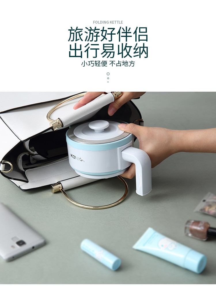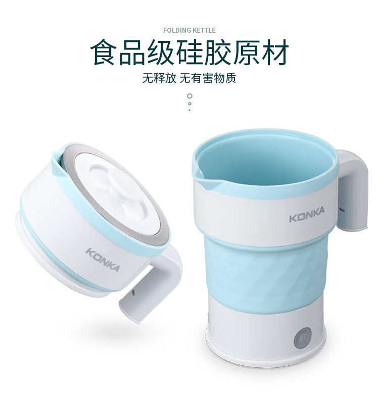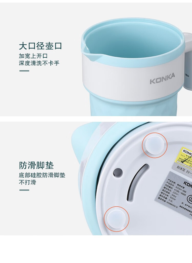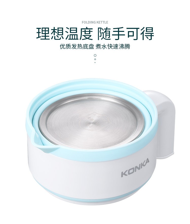 • 商品品牌: 康佳(KONKA) • 商品型号: KGBL-998B • 商品毛重:0.81kg • 商品产地:中国大陆 • 特色功能:防干烧,迷你便携型,自动断电 • 商品材质:食品级硅胶 • 商品容量:1L及以下 • 商品类别:电热水壶