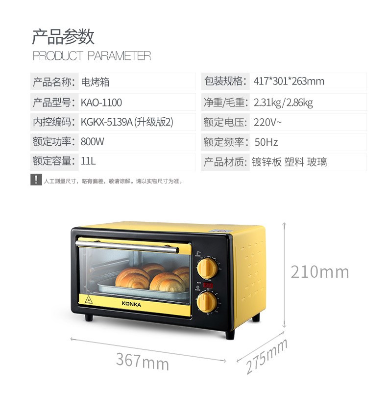 • 商品品牌:康佳(KONKA) • 商品型号:KGKX-5139A • 商品毛重:2.81kg • 操控方式:手动机械 • 商品类别:烤箱 • 加热管数量:3根以下 • 外观式样:立式 • 适用人数:8人以上 • 特色功能:热风循环 • 内胆材质:镀锌板 • 温控方式:上下独立调温