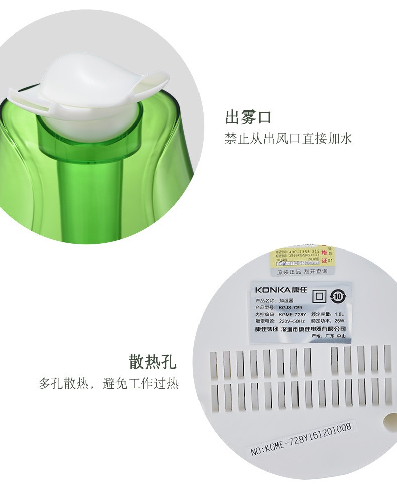 • 商品品牌: 康佳(KONKA) • 商品型号: KGME-728Y • 商品毛重:0.87kg • 水箱容积:3L以下 • 商品类型:净化型 • 加水方式:便捷上加水 • 适用场景:家用