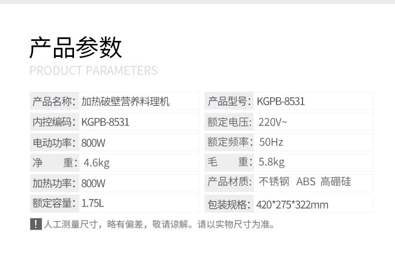 • 商品品牌: 康佳(KONKA) • 商品型号: KGPB-8531 • 商品毛重:5.67kg • 特色功能:预约,变频,加热,保温,研磨 • 商品功率:700W-900W • 主杯容量(L):1.71L-1.8L