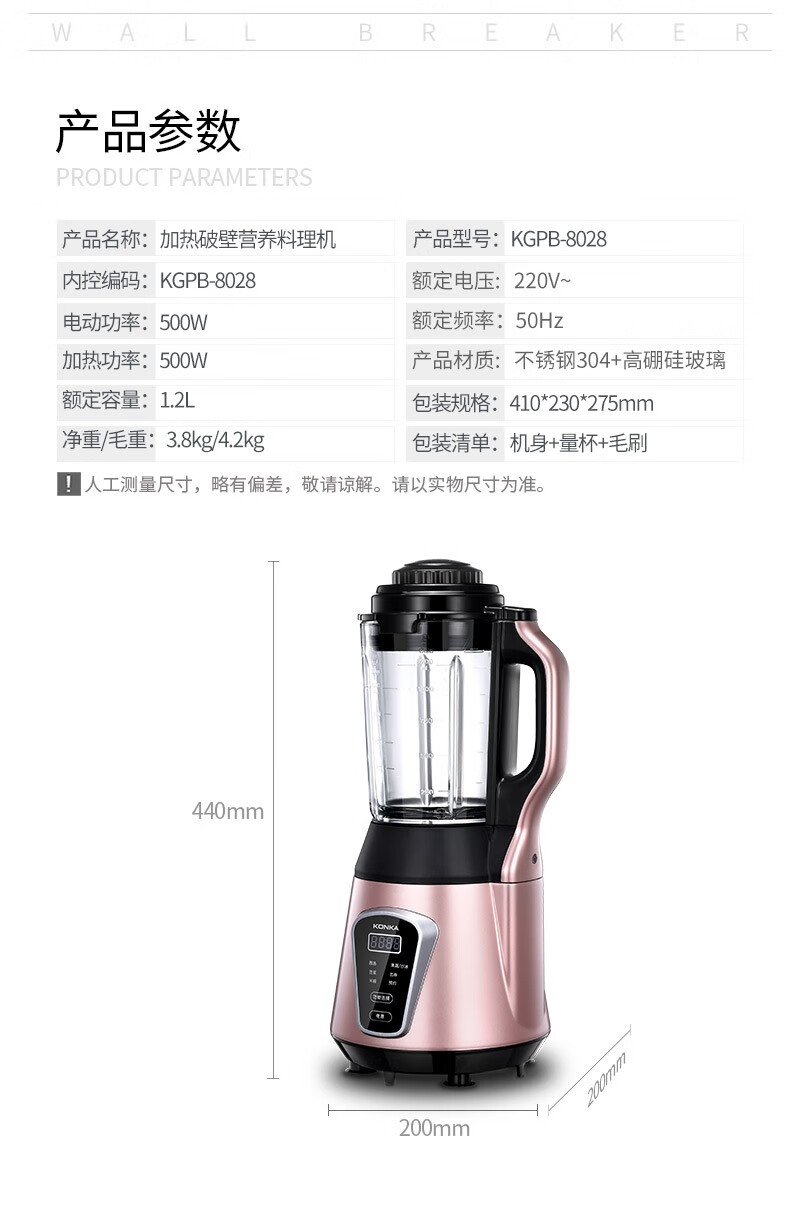 • 商品品牌: 康佳(KONKA) • 商品型号: KGPB-8028 • 商品毛重:4.2kg • 特色功能:加热 • 商品功率:500W-700W • 主杯容量(L):1L-1.2L