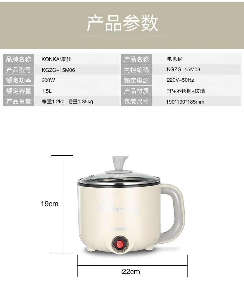 • 商品品牌: 康佳(KONKA) • 商品型号: KGZG-15M09 • 商品毛重:1.35kg • 操控方式:机械式 • 商品容量:2L及以下 • 特色功能:保温,防干烧