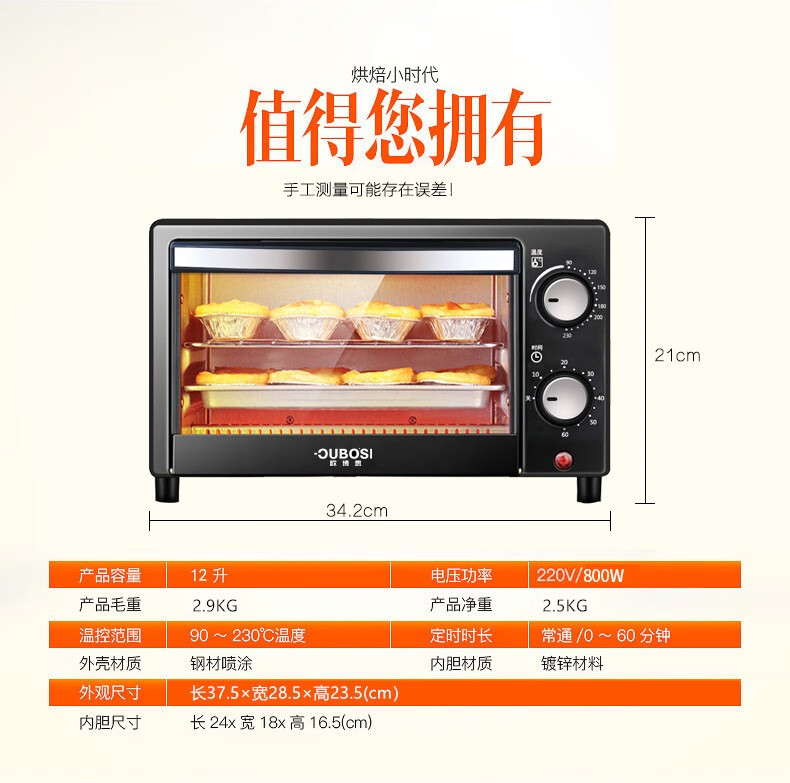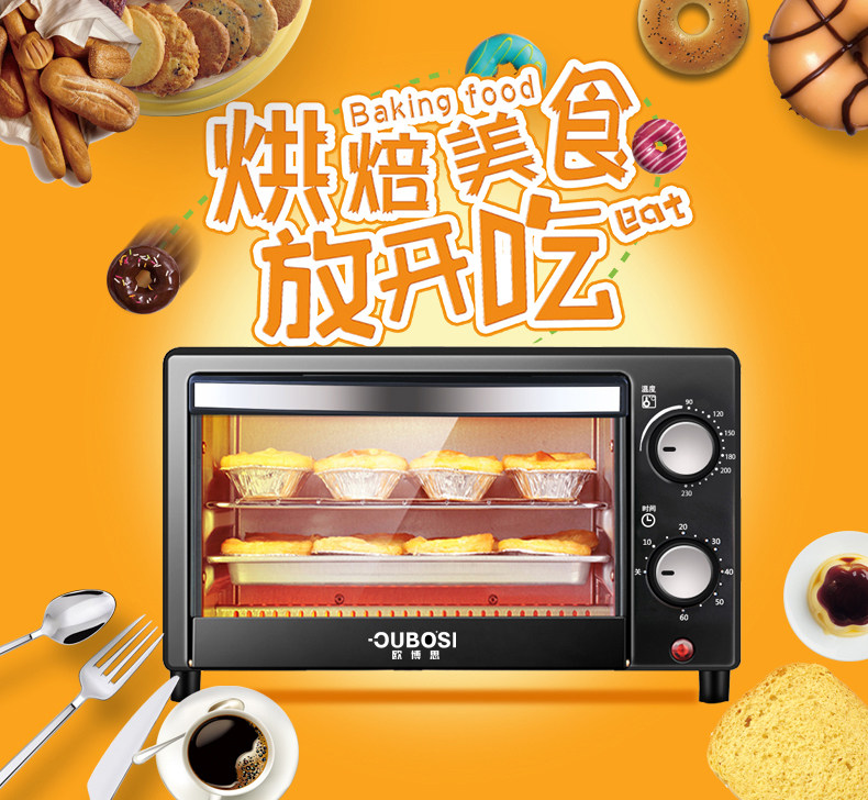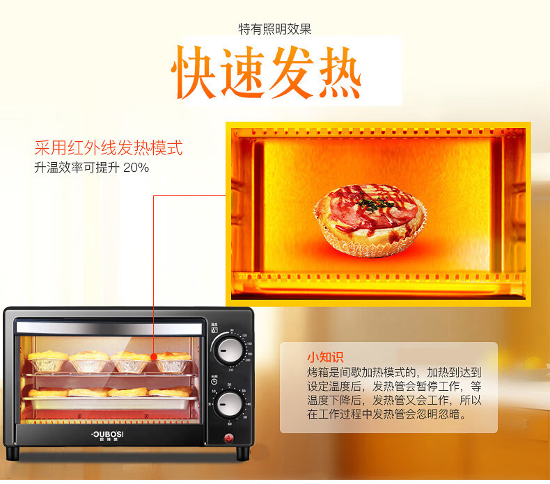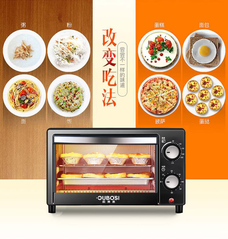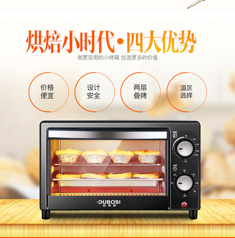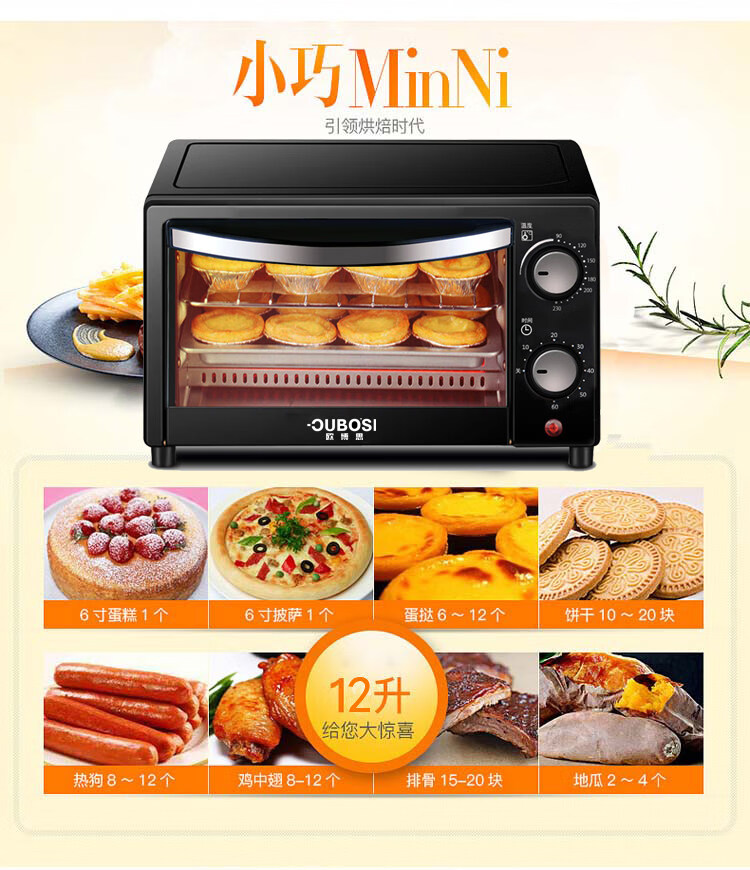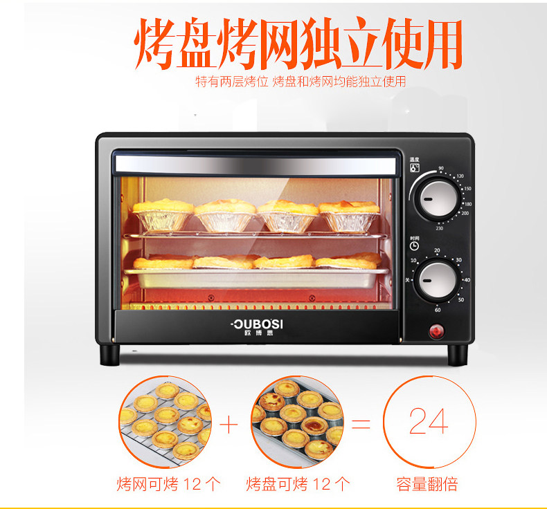 • 商品品牌: 欧博思(OUBOSI) • 商品毛重:2.9kg • 商品产地:中国大陆 • 操控方式:手动机械 • 商品类别:烤箱 • 加热管数量:4-6根 • 外观式样:立式 • 适用人数:3-5人 • 配件功能:双层密封玻璃 • 内胆材质:不锈钢 • 温控方式:上下一体调温
